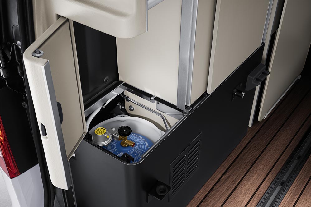 Hasta ahí las semejanzas, porque ahora te expongo las cualidades por las que, al igual que el 65% de los compradores, me decantaría por el Marco Polo a la hora de adquirir uno u otro vehículo. El Marco Polo ‘a secas’ es una auténtica casa con ruedas. No le falta detalle: fregadero, cocina de gas con dos fogones alimentados por un camping gas cuya bombona está oculta, refrigerador con una capacidad de 40 litros -medido en cervezas, pueden caber muchas, muchas latas-, múltiples armarios y cajones que ocultan cubiertos, sartenes y juego de café completo; ducha, depósito de agua potable de 30 litros, de aguas residuales de 40, suelo en madera estilo náutico… Quizás solo le falte un espejo de pie, aunque si no pecas de narcisista, no lo echarás en falta. Además, el maletero alberga dos sillas y una mesa, todas ellas, plegables.