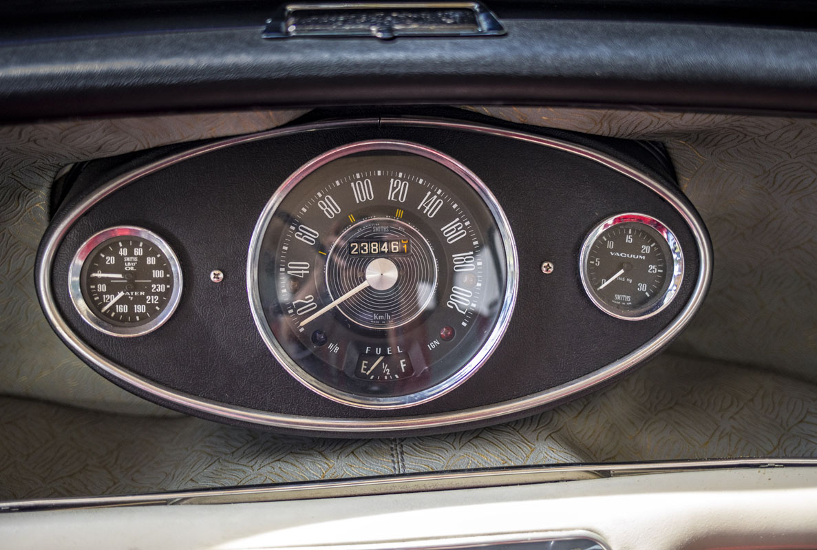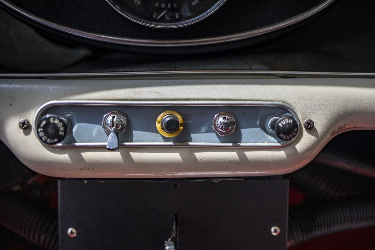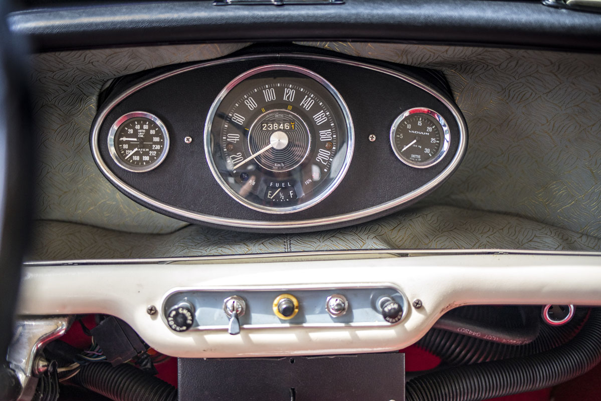 El cuadro de instrumentos de estos Mini Cooper S británicos no tiene nada que ver con el repleto de relojes de los 1275 GT de Authi. Aquí sólo hay un velocímetro grande con el aforador de combustible integrado, un termómetro de agua y manómetro de presión de aceite a su izquierda y un vacuómetro a la derecha. Este indicador nos permite controlar si todo va bien con la carburación o si hay una toma de aire en el colector de admisión, además de servirnos también como económetro.