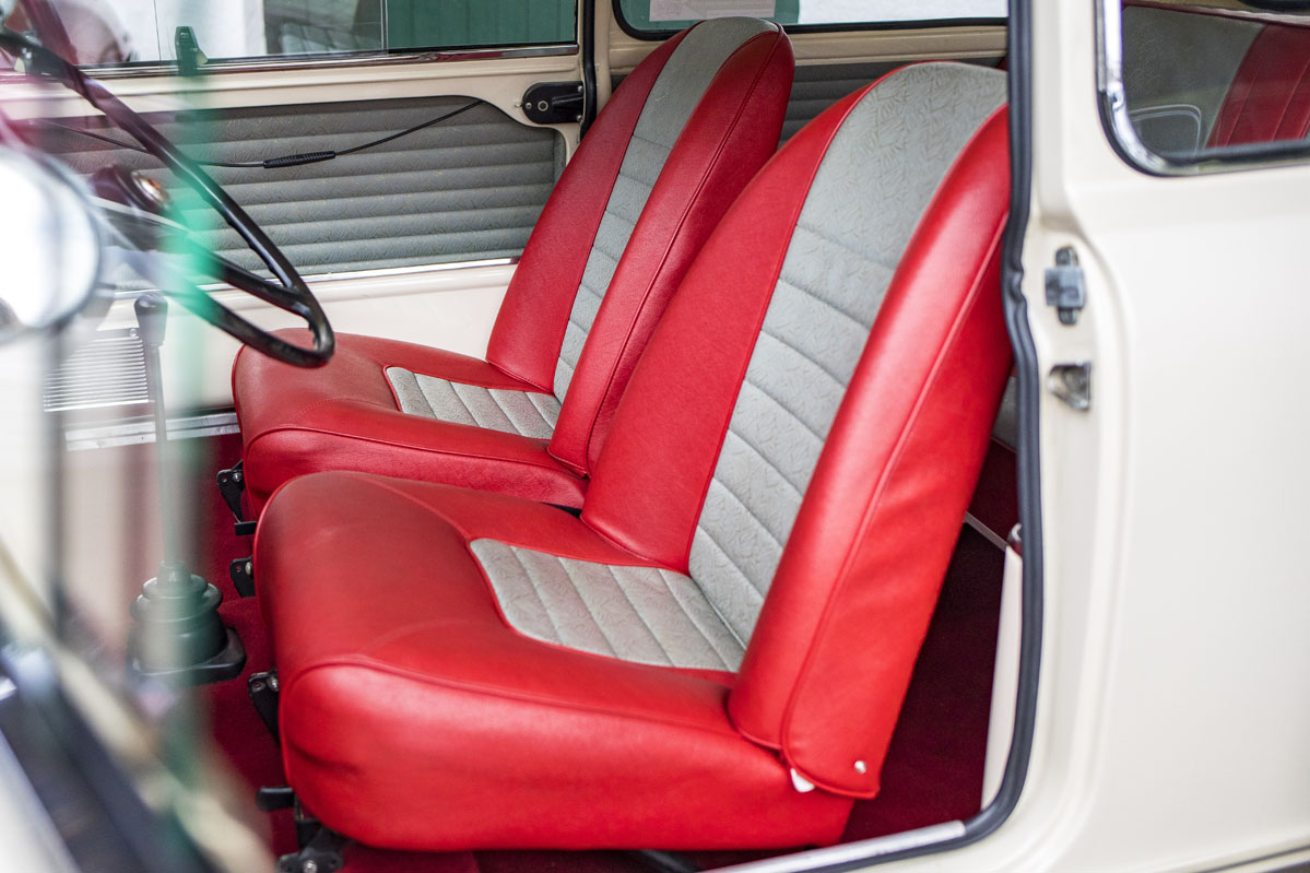 asientos de cuero rojo y gris del Mini Cooper S 1275 MK1Abro la puerta y me meto dentro de él y no hay sorpresas salvo por la configuración de los asientos, que son más envolventes que los que he probado en otras ocasiones en modelos de Authi.