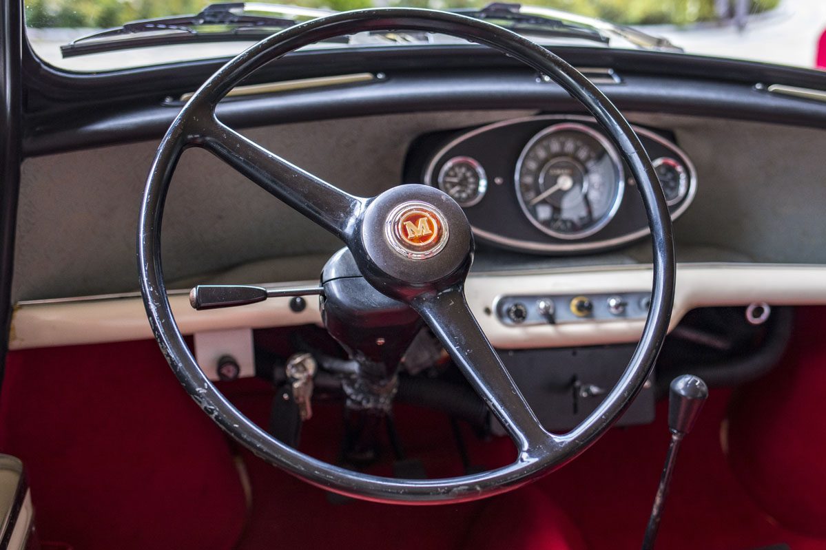 Aunque no hay dirección asistida y este ejemplar lleva unas ruedas anchas y de muy poco diámetro (sólo 10 pulgadas de diámetro… como las de una carretilla de mano), la dirección se mueve muy bien si evitamos hacerlo con el coche completamente detenido.