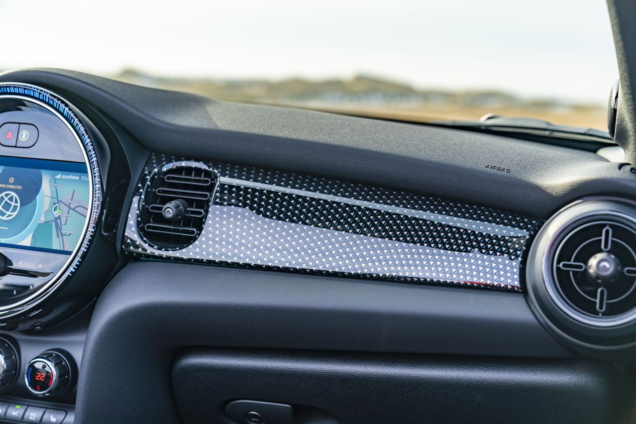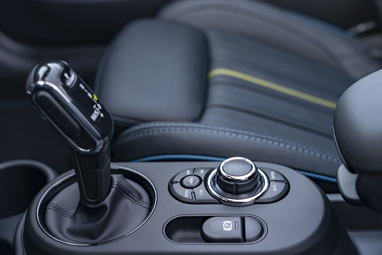 El interior también se ha renovado con una pantalla de 8,8 pulgadas, la del sistema multimedia, y una de 5 que hace la función de cuadro de instrumentos y que ya había visto durante la prueba del MINI John Cooper Works GP. Me parece un gran recurso. También es nuevo el volante, que sigue teniendo tres radios, pero que incorpora unos botones físicos en acabado negro piano, que a la vista queda mejor, pero que dan la sensación de ser menos consistentes. Y al tratarse de la edición Sidewalk suma unas molduras de metal cepillado en los umbrales de las puertas y otras con pintura efecto petróleo en los paneles de las puertas -puntazo-, además de una tapicería de cuero denominada ‘MINI Yourts Leather Lounge Sidewalk’. Esta combina con el tono antracita con costuras en Dark Petrol y Energetic Yellow y con los trenzados en color petróleo.