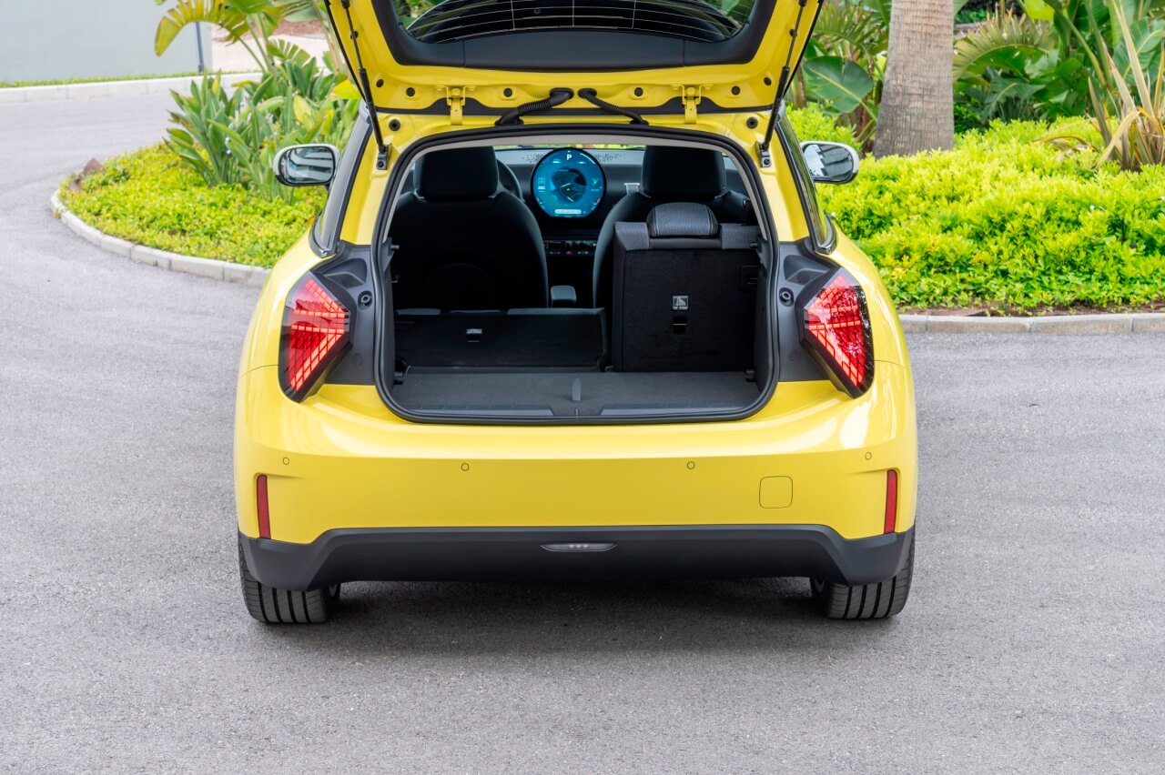 El MINI Cooper eléctrico sigue siendo un coche de tres puertas con un interior para cuatro pasajeros, donde las plazas traseras son muy angostas y cuyo acceso es complicado. Aun así, tienen un espacio óptimo para niños y los dos asientos traseros incluyen anclajes ISOFIX para sillas infantiles. El maletero, que tiene un compartimento bajo el piso donde puedes guardar el cable de carga, ofrece 210 litros de capacidad volumétrica, ampliables hasta los 800 litros al abatir los respaldos traseros divididos en proporción 60:40.