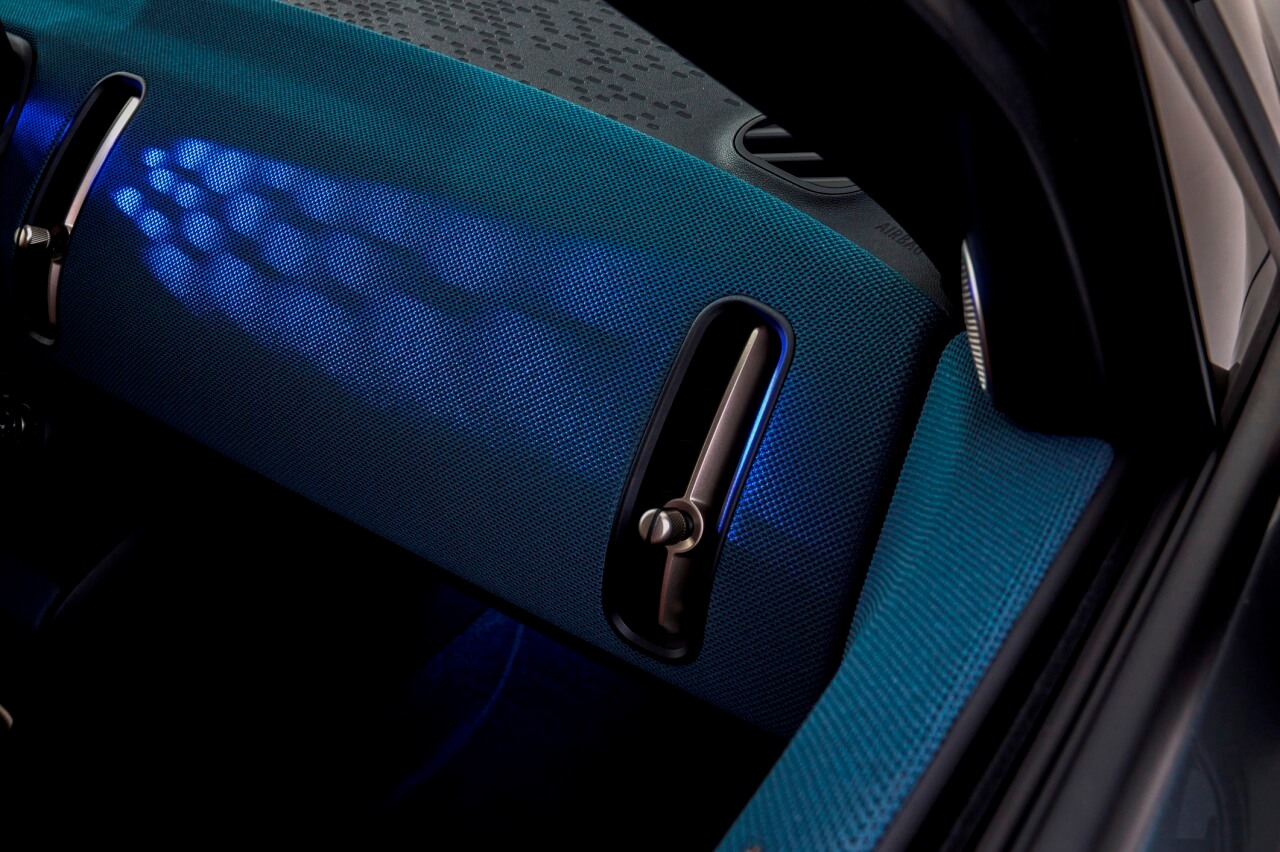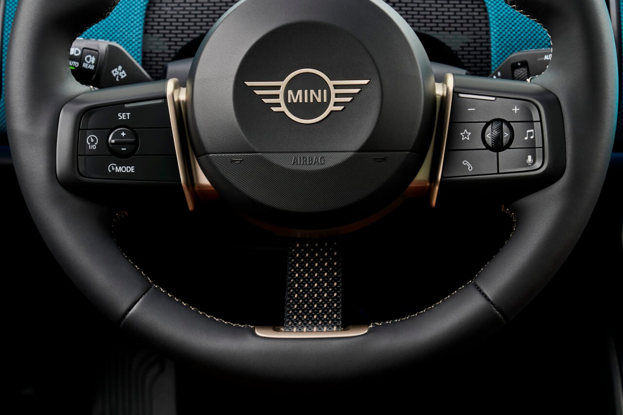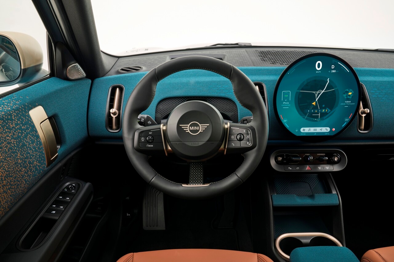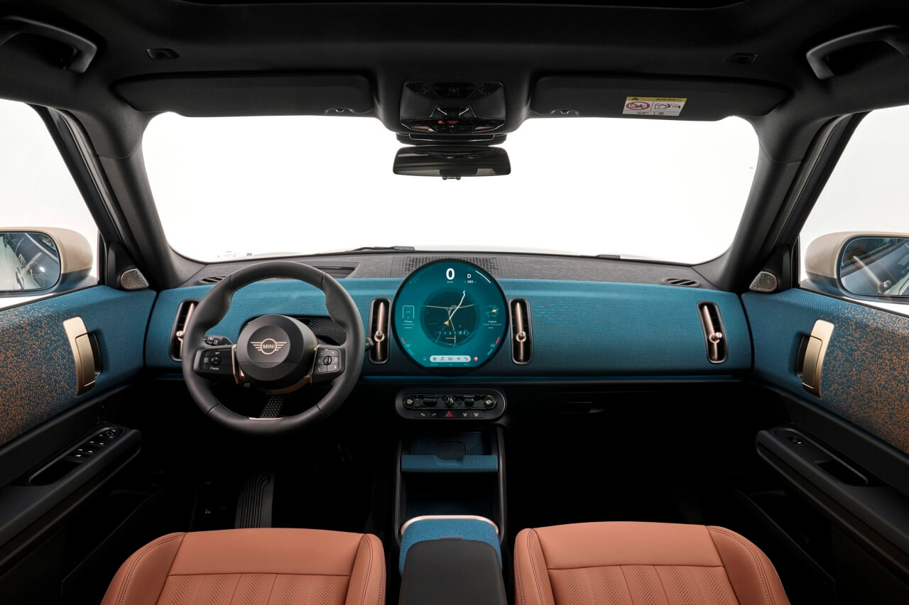En el interior, la fórmula se repite. Los diseñadores de MINI han optado por un estilo minimalista en cuanto al número de elementos disponibles, aunque con detalles ornamentales como lo son las salidas de ventilación verticales o los tiradores de puerta. También hay un volante de nuevo diseño, que comparte con el MINI Cooper eléctrico, con una cinta haciendo las veces de tercer radio, y una consola central flotante donde se integran los pocos interruptores físicos que encontramos en la cabina.
