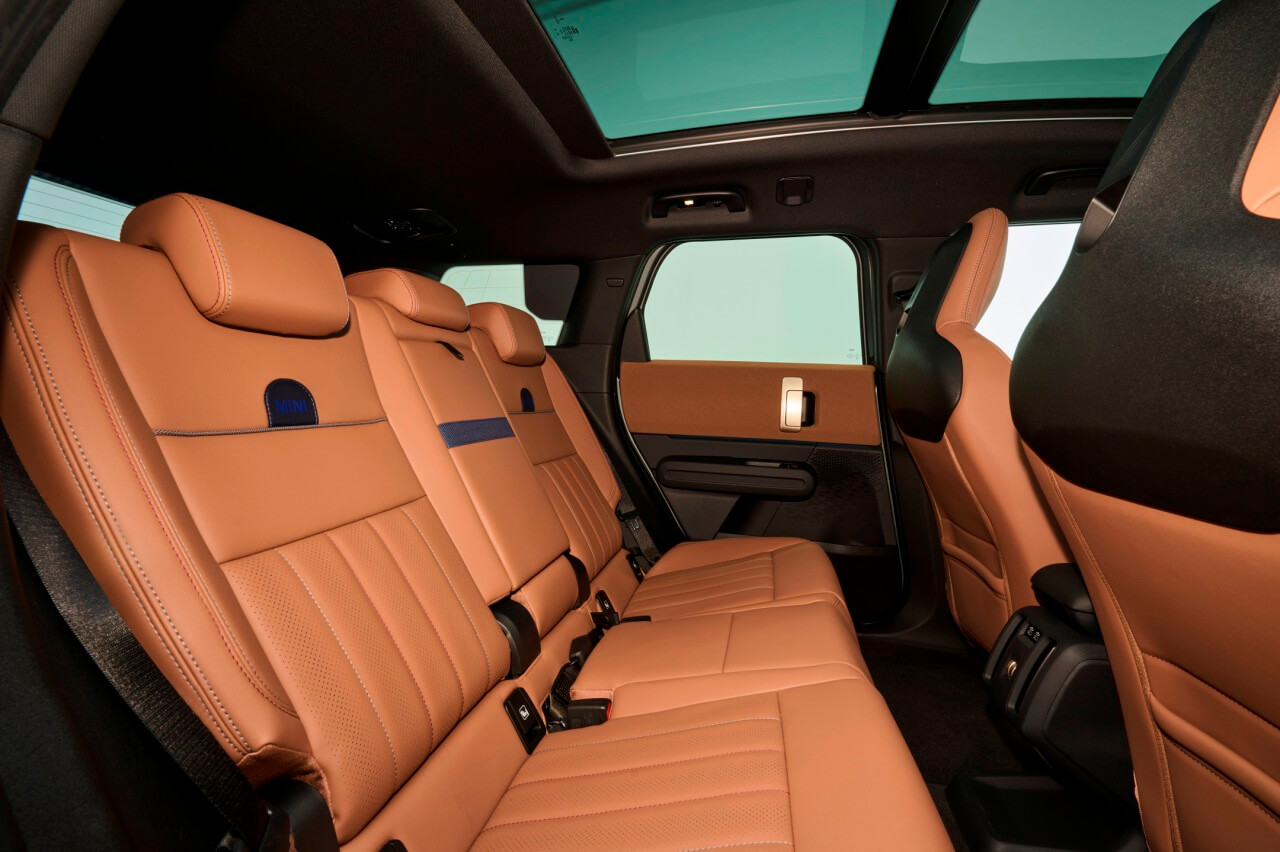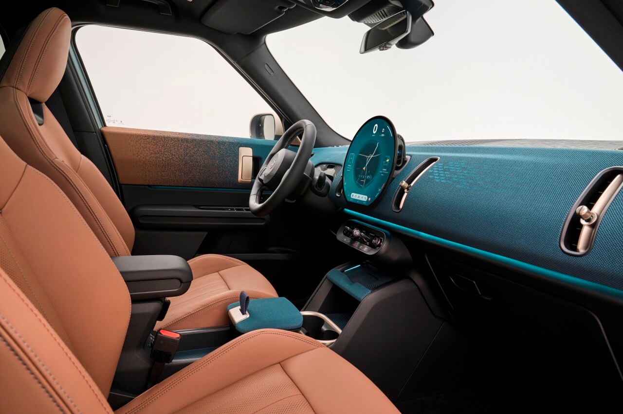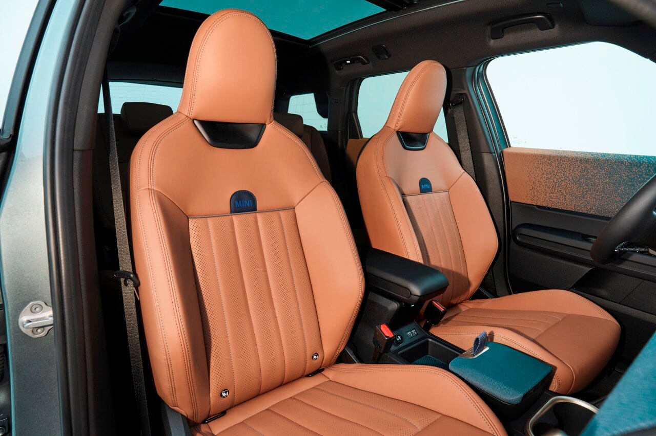 El Countryman sigue la nueva filosofía de sostenibilidad de MINI, integrando un nuevo tejido hecho de poliéster reciclado que cubre el salpicadero y la parte superior de los paneles de las puertas. Incluso está presente en la tapa del curioso compartimento ubicado entre los asientos delanteros. Y hablando de los asientos, están tapizados con cuero vegano disponible en diferentes combinaciones de color y costuras.