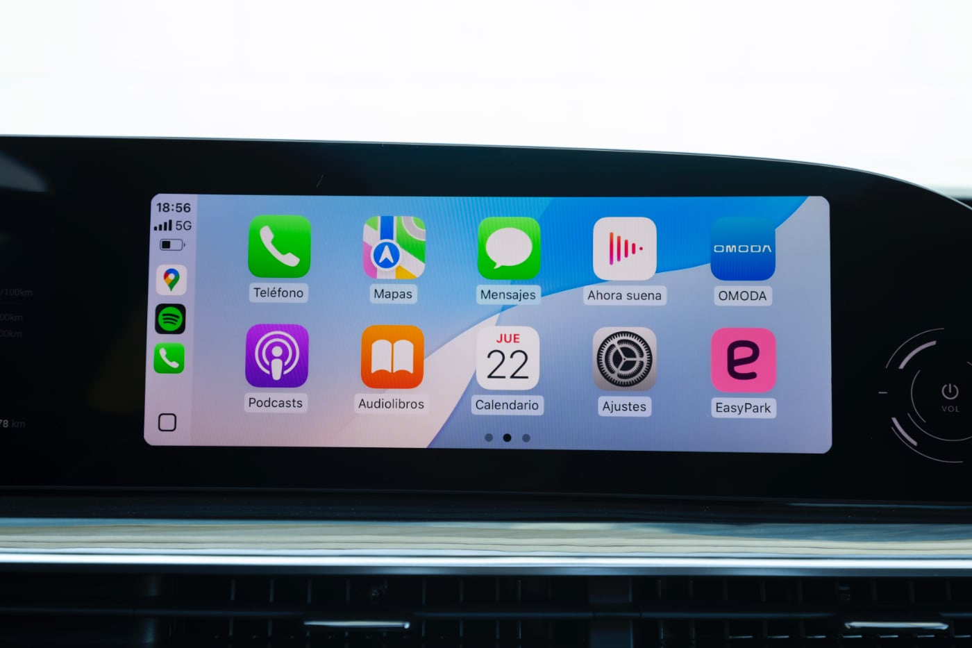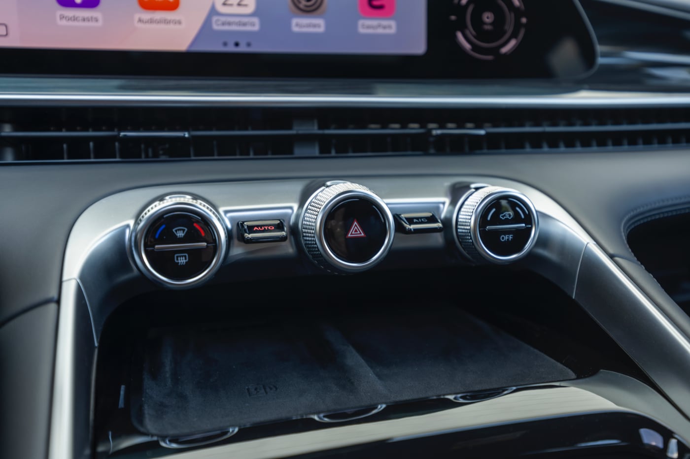 Como la palanca del cambio está situada en la columna de la dirección, hay muchos huecos portaobjetos en la consola central. Destaca la guantera refrigerada que esconde el reposabrazos central y el de la parte superior, que tiene para carga inalámbrica de 50 W para smartphones -por supuesto, Apple CarPlay y Android Auto sin cables-.