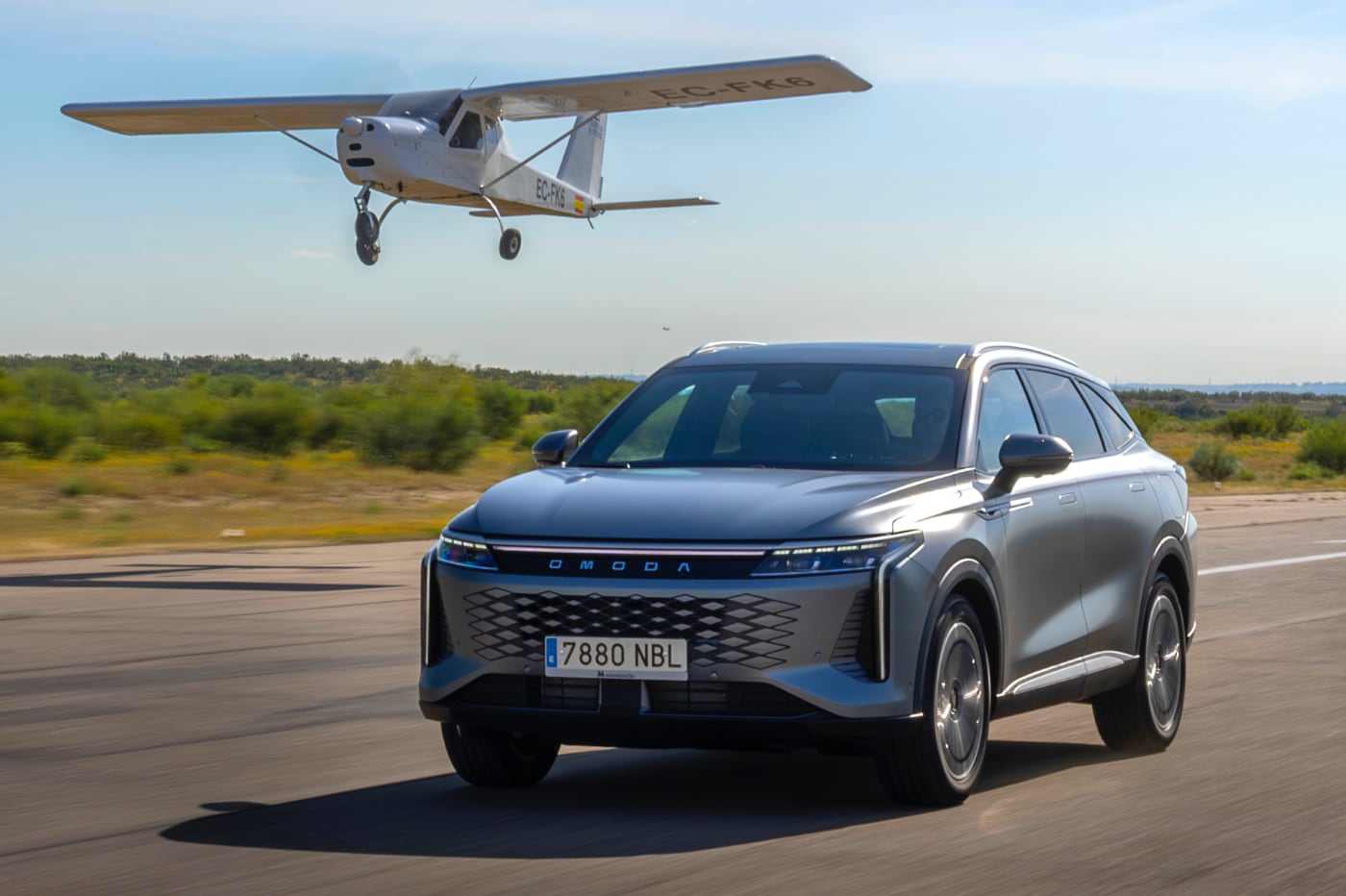 Ese despliegue de potencia y par junto a su tracción 4x4 y al cambio automático 3DHT de 3 velocidades permiten al Omoda 9 SHS pasar de 0 a 100 km/h en 4,9 segundos, y de 90 a 120 km/h en 2,8 segundos. Lo he podido sentir en la pista de despegue, donde he podido disfrutar de pruebas de aceleración y frenada y donde he podido ver su respuesta en un Mickey Mouse. Y es que es rápido, muy rápido. Por su parte, la velocidad máxima es de 180 km/h. Y todo ello con un consumo 1,7 l/100 km y uno sin batería de 7,0 l/100 km.