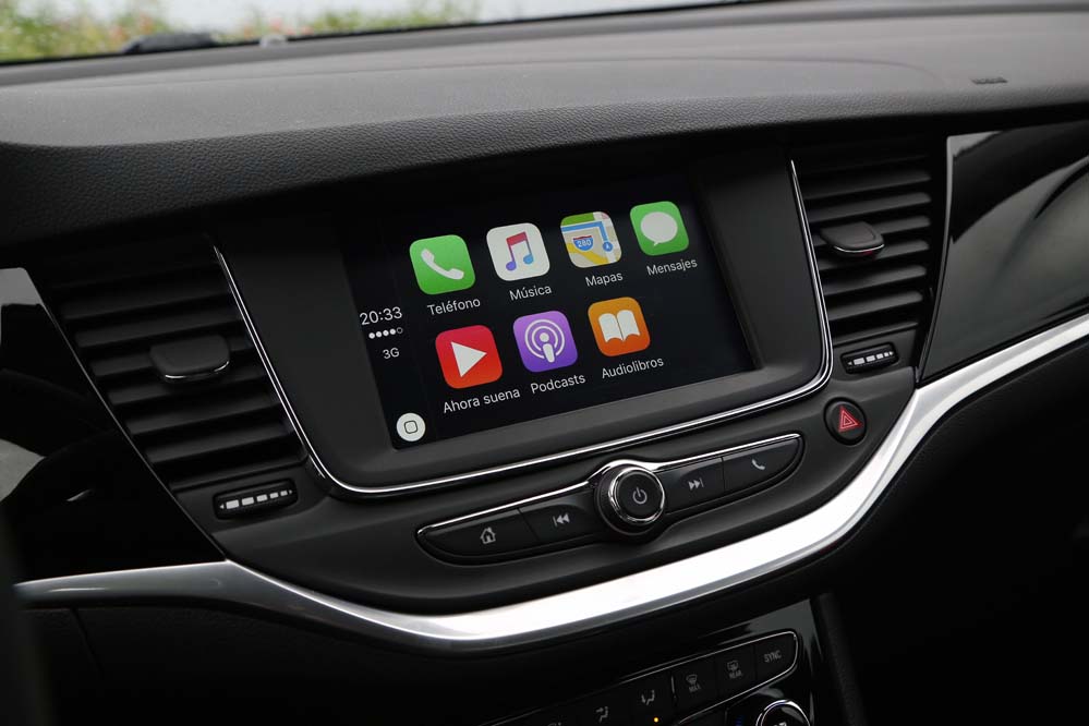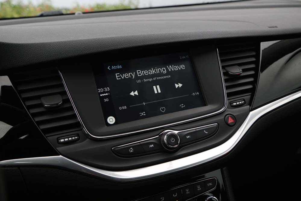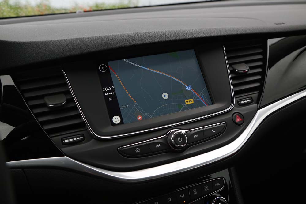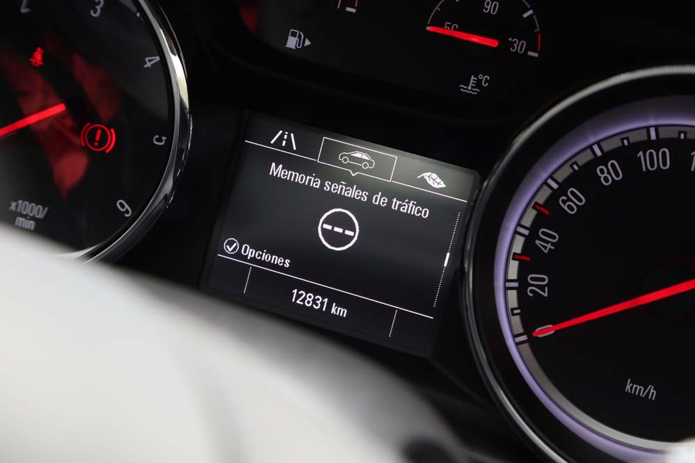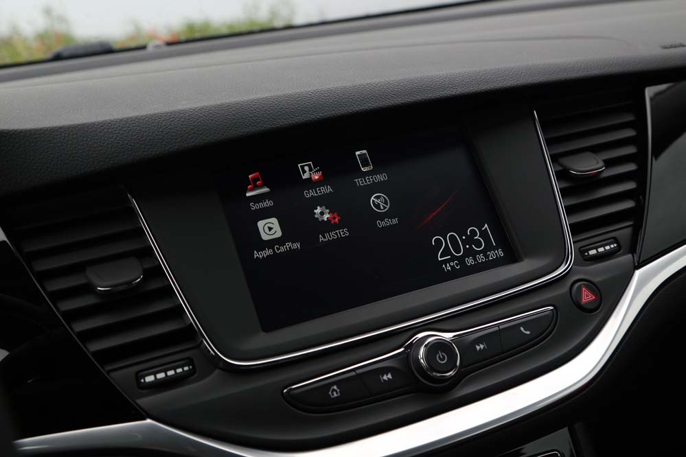El sistema Opel Eye emplea una cámara frontal para asumir tareas orientadas a la seguridad en la conducción, como la detección de señales viales, el aviso y corrección de trayectoria en caso de cambio involuntario de carril, así como el aviso del mantenimiento de la distancia de seguridad y la frenada activa en ciudad para evitar una colisión -siempre que la velocidad sea inferior a los 60 km/h-. El apartado multimedia queda encargado a IntelliLink 4.0, que en la unidad probada se compone de una pantalla a color de siete pulgadas que permite duplicar la información mostrada en nuestro teléfono mediante Apple Carplay o Android Auto -incluyendo la navegación, que no está presente de modo nativo y requiere de 900€ extras para instalar el paquete Navi900-.