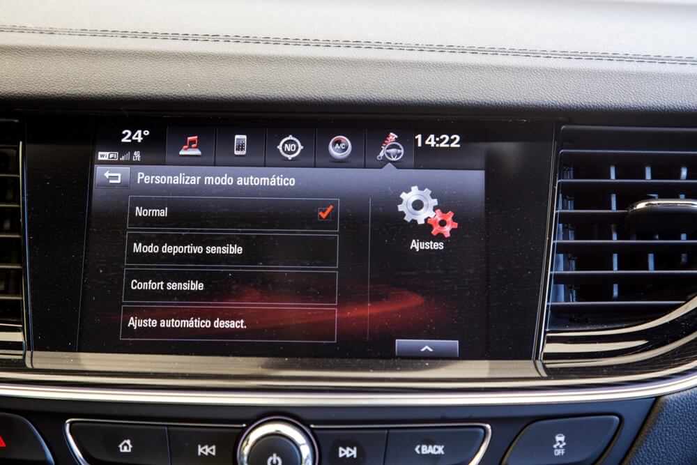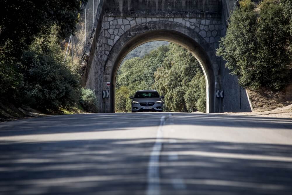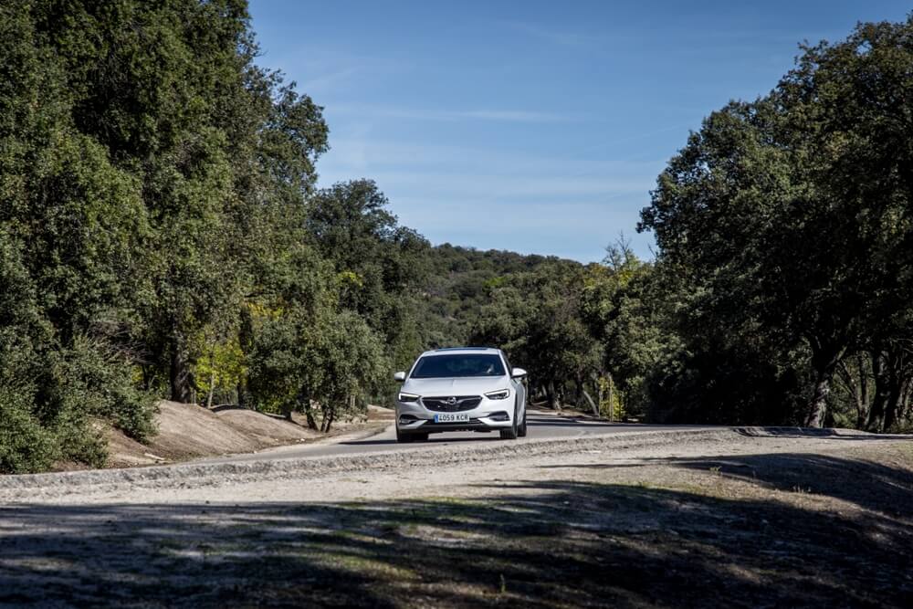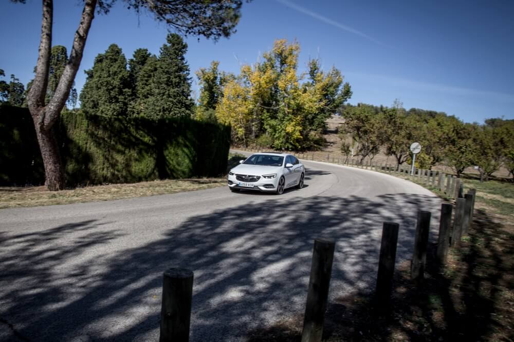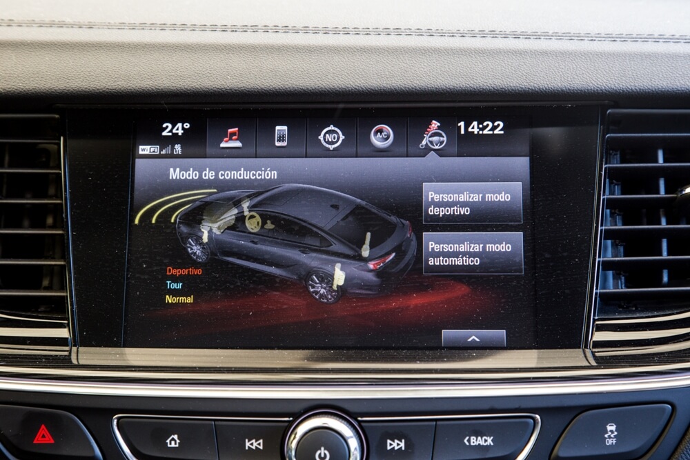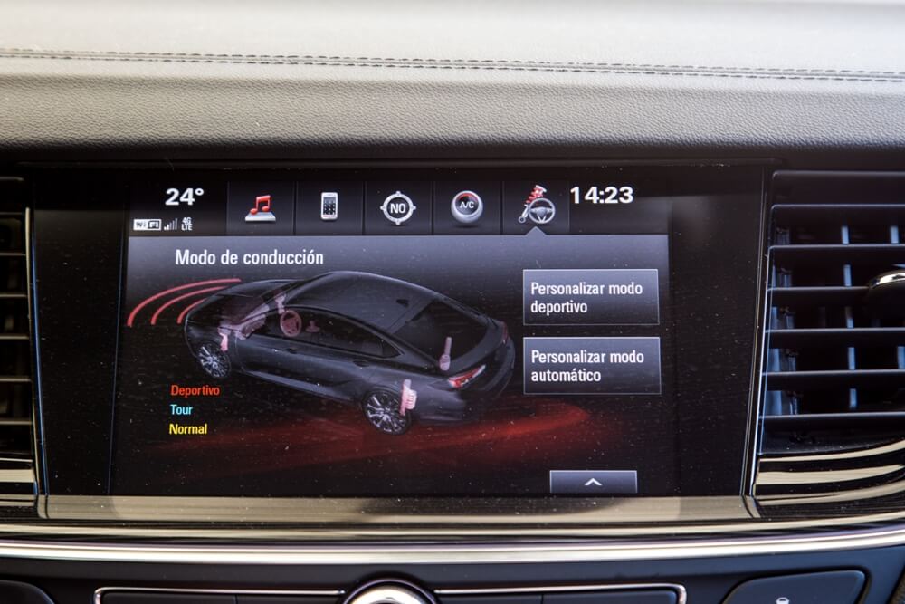 Inicio la marcha y me encuentro con un tacto de la dirección suave y una caja de cambios rápida que no acusa el tipo del que se trata, ya que en otras transmisiones de tipo convertidor de par se aprecia un exceso de revoluciones en las aceleraciones y la ausencia de transiciones entre marchas. Es fácilmente reconocible la mejora en la reducción de ruidos y vibraciones, pero se acusa el sonido de la rodadura, donde los neumáticos 245/35 de 20 pulgadas no contribuyen lo más mínimo a mantener la calma. En su configuración ‘Normal’, el Insignia se muestra equilibrado, pero también ofrece dos modos de conducción adicionales dentro del sistema FlexRide situados en la consola central. El modo ‘Tour’ permite que la dirección sea más blanda y la suspensión infinitamente menos rígida, lo que hace que los cambios de apoyo en curva sean demasiado pronunciados e incluso se acusen varios rebotes de la amortiguación al paso por badenes o resaltos. También ejecuta los cambios de velocidades a más bajo régimen. Mientras tanto, el modo ‘Sport’ es todo lo contrario, con una suspensión y un tacto de la dirección más firme y unos cambios de marcha, así como reacción al acelerador, mucho más definidos.