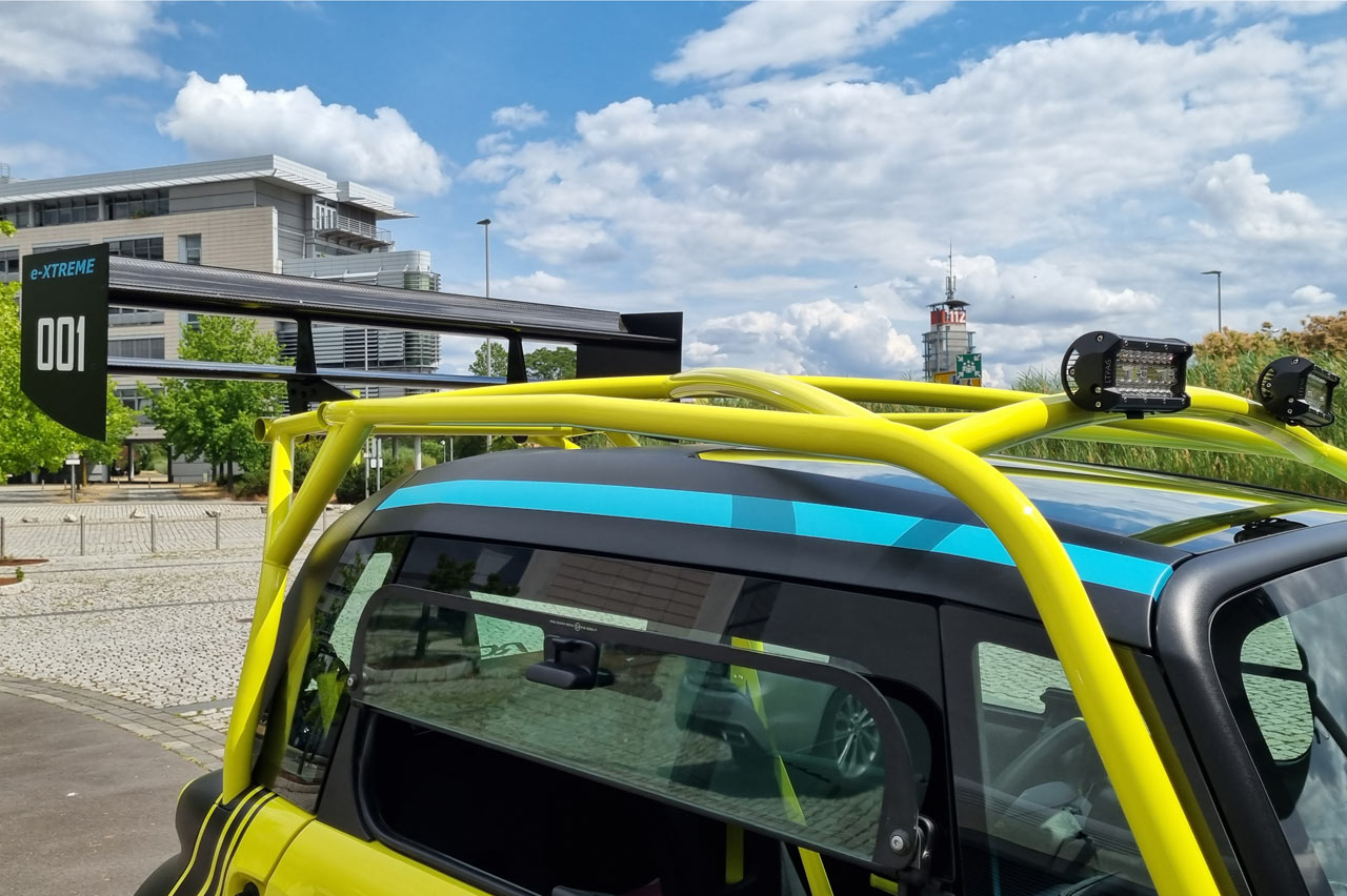 Para salir de lo negro con total seguridad se ha acoplado una jaula antivuelco atornillada de forma externa, pintada en amarillo, bien chillón. Y para conseguir la mejor aerodinámica, o simplemente una estética más agresiva, equipa el alerón del Vectra GTS V8 del DTM, y que, además de estar fabricado en carbono, exhibe el número 00 en blanco y la palabra e-xtreme en azul turquesa, mismo color usado para bañar el logotipo que trae el Opel Vizor, que estrena luces LED rediseñadas.