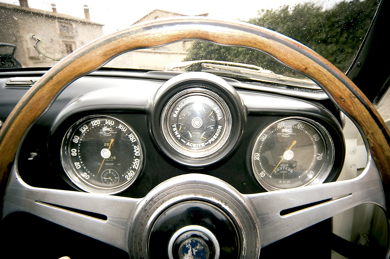 Me encajo, pues, tras el enorme volante de madera Nardi y me quedo embobado con los relojes Jaeger tan enormes que hay detrás. Y en un gesto reflejo, miro, como cuando éramos pequeños y casi todos los tacómetros eran analógicos, el último número del velocímetro, para ver “cuánto corre”: este marca 240 km/h por hora y me imagino que con semejante mecánica y pedigrí, seguro que sí, que en condiciones ideales de pista y seguridad, podría, al menos pasar de los 200. También me encanta que debajo del caballo ponga ‘ENASA’, aunque la gente recuerde menos aún esa palabra que la de Pegaso.