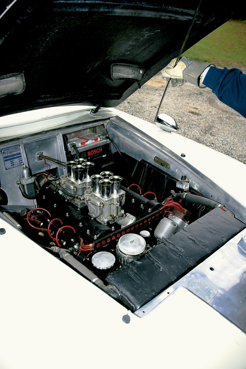 Yo también estoy a punto de cumplir un sueño infantil, con la prueba de este portento de la historia, la ingeniería, la exclusividad y la técnica. Giro la llave de contacto, aprieto un botón y los 8 cilindros en V de este poderoso motor (este monta un bloque de 2,8 litros, 172 CV y dos carburadores de cuatro cuerpos) hacen que el capó brame, vibre y se mueva un poquito. Tal y como reconoce su propietario, “en los 50 era un superdeportivo; y ahora, un camión rápido”. Pero si yo tendría tan ricamente un camión de esta marca en mi garaje, ¡cómo no iba a tener precisamente este!