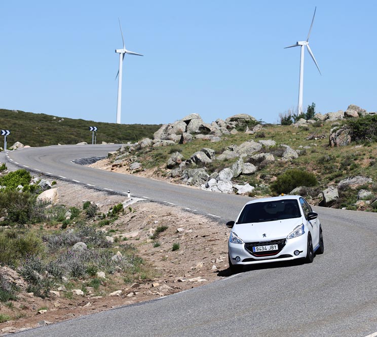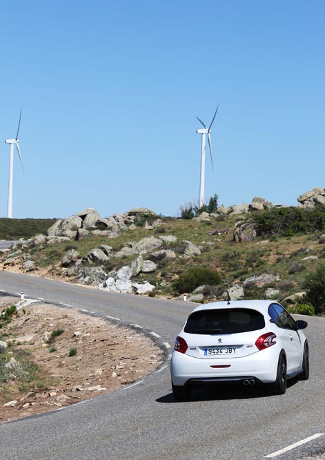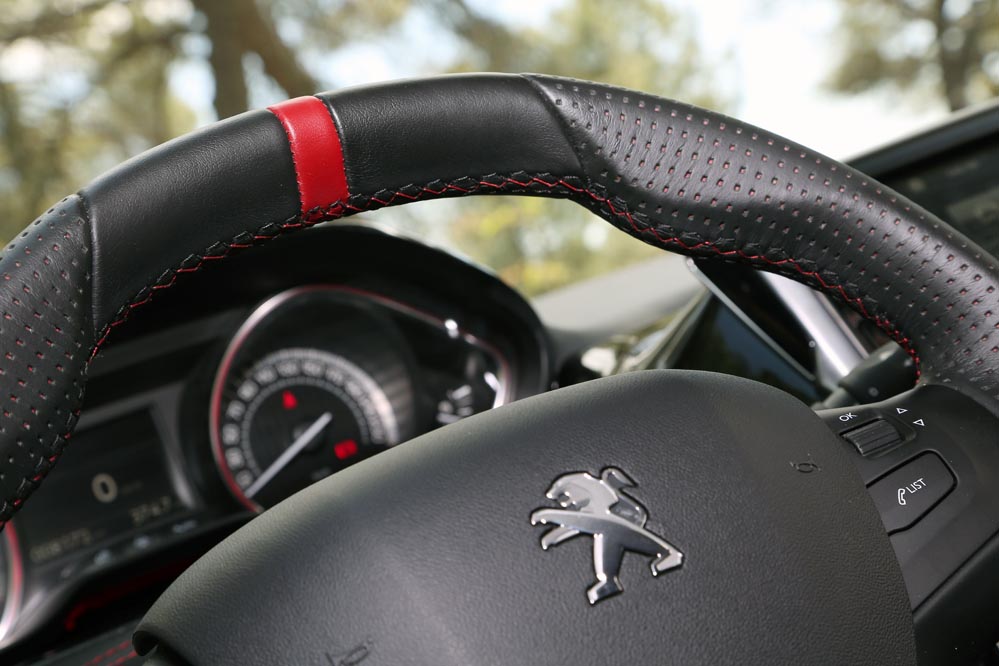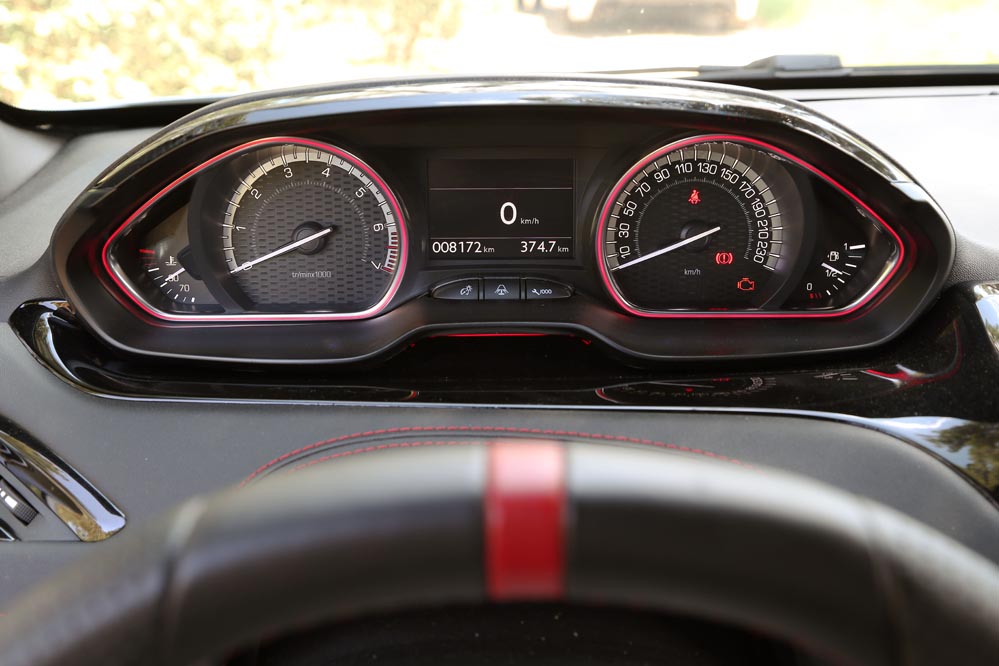 Una vez a los mandos, resulta casi imposible no acelerar de forma intermitente para disfrutar del sonido modificado de los escapes... Ya en marcha, compruebo que el cambio funciona de forma precisa y se aleja del tacto un tanto blando de algunos modelos de la marca del león. El volante, de reducidas dimensiones resulta ideal para curvear... Aunque la discutible disposición del cuadro de mandos hace que me tape parte del cuadro de instrumentos.