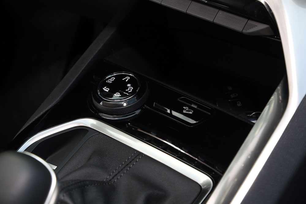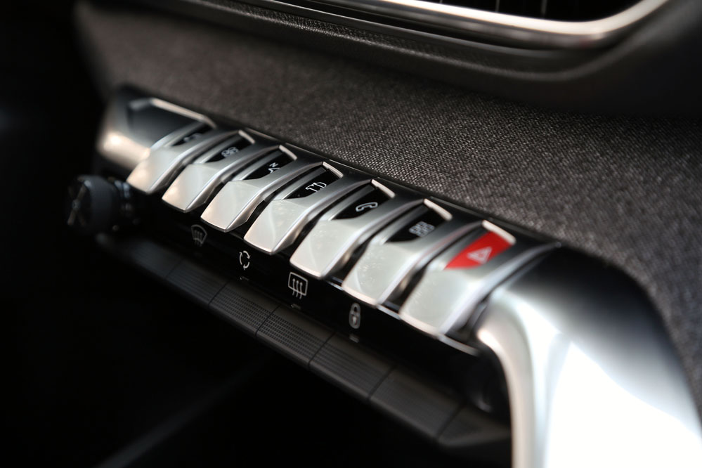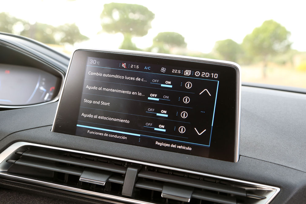 Pero, sinceramente, donde más me ha sorprendido este león ha sido en el interior. El salto dado por Peugeot en este apartado es espectacular. El primer componente a destacar es el cuadro de instrumentos digital de 12.3 pulgadas, que en esta ocasión no es tapado por el volante, que, por cierto, para mi gusto tiene un diámetro perfecto, aunque desecharía su forma achatada por la parte superior e inferior. El Peugeot i-Cockpit digital (imagen) reúne toda la información necesaria con una interfaz totalmente configurable, a la altura del Audi Virtual Cockpit, pero más atractiva que la del Volkswagen Digital Cockpit. El segundo elemento a destacar son las Toggles Switches (imagen), las teclas tipo piano que permiten un acceso rápido a la radio, sistema de climatización, navegador, app del móvil, teléfono y configuración del coche. Con ellas, Peugeot ha logrado ofrecer una consola simplificada, en lo que a botones se refiere, pero sin omitir los indispensables, cosa que sí que ocurre, para incomodidad del conductor, en otros productos de la marca, del Grupo PSA e incluso de otros fabricantes como Renault. Buen trabajo en este aspecto. El último detalle que destacaría por lo innovador y el efecto que consigue es el tapizado, parecido al del tejido vaquero, que se ha utilizado en los paneles de las puertas y el salpicadero. Con él se consigue un toque moderno a la vez que se incrementa la calidad percibida. Calidad percibida que también es al tacto, puesto que la inmensa mayoría de plásticos son blandos, incluso los del túnel de transmisión, la guantera o los guarnecidos de las puertas, algo complicado de ver en otros vehículos de su segmento. También influyen los múltiples elementos con aspecto de metal -la mayoría son plásticos-, repartidos por el salpicadero, aunque alguno de ellos, como el del pomo del cambio, al sol puede conseguir que te marque la piel cual Miura. El rizo lo riza la pantalla de 8 pulgadas tipo tablet alojada en el centro del salpicadero.