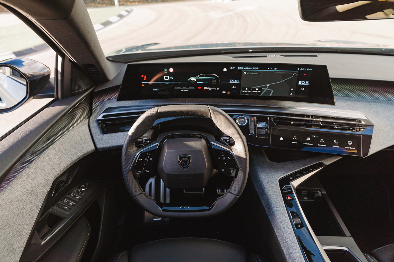 Desde el puesto de mando no puedo evitar fijarme en la gran pantalla flotante curva, que según Peugeot, alcanza un tamaño de 21”. Ofrece múltiples opciones de configuración tanto para la sección dedicada al cuadro de mandos como en la parte de información y entretenimiento.