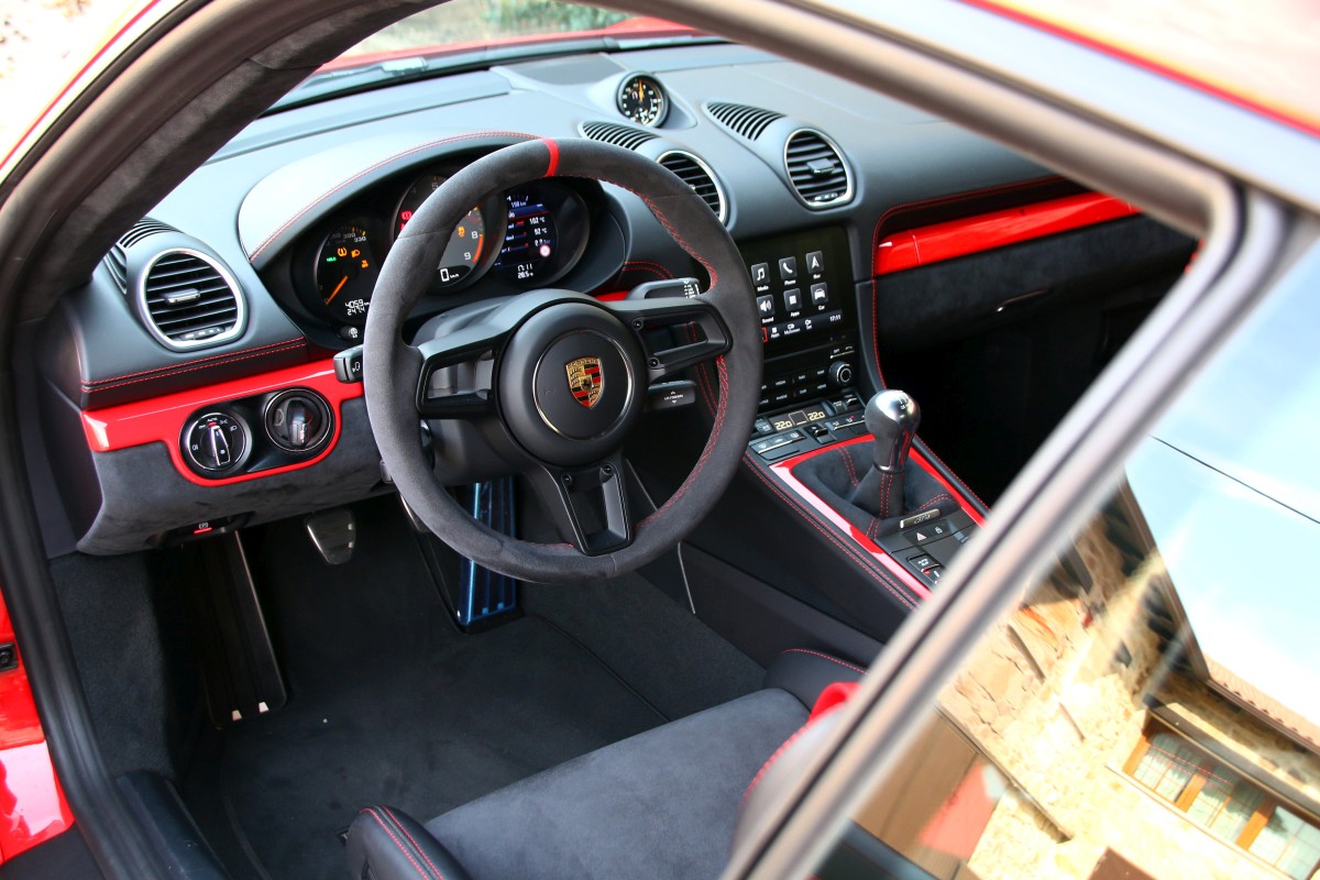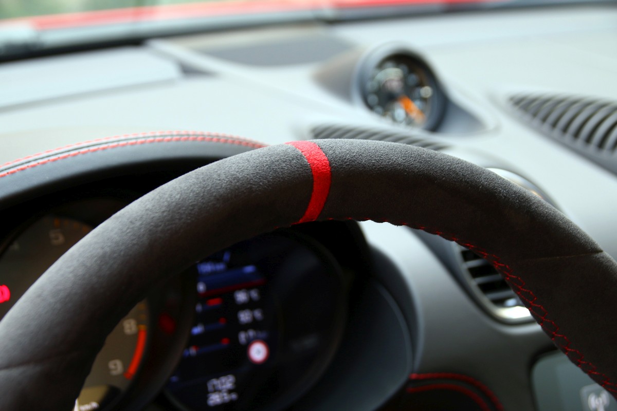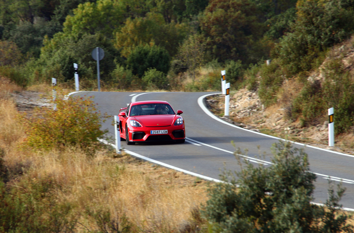El 6 cilindros bóxer que late en posición central del GT4 (detrás del conductor) cobra vida con fuerza tras girar la llave de contacto. Toda una declaración de intenciones. La primera sorpresa llega en el recorrido urbano que me lleva de camino a mi zona de pruebas habitual. El GT4, a pesar de ser firme de chasis y relativamente incómodo por la dureza y posición de sus asientos tipo bacquet, se mueve bien en las calles. La dirección no es dura, el cambio es de tacto preciso y suave, y el embrague no solo ofrece una resistencia adecuada a la hora de pisar el pedal sino que tiene un punto de fricción generoso, que hace que las arrancadas sean siempre fáciles. Vamos, que a la hora de moverse despacio, el GT4 es un coche amable. Esto quizá le parezca poco a importante a mucha gente, dado que es un coche pensado para ir rápido y todo lo demás debería ir al saco de lo poco o nada relevante. Pero en este momento me viene a la cabeza, por ejemplo, aquel 997 GT2 que pasó por mis manos hace unos años, que me dejó serias agujetas en la pierna izquierda por su embrague de tacto infernalmente duro. Y ese coche era realmente bueno, ojo, pero aquella larga jornada en la que combiné recorridos urbanos, carreteras secundarias y circuito, me hizo despedirme de él con una cierta sensación de amor-odio que no se me va de la cabeza. Y no, eso no pasa con el Porsche 718 Cayman GT4 que pruebo, a pesar de ser un vehículo con cierto tinte de radicalidad.