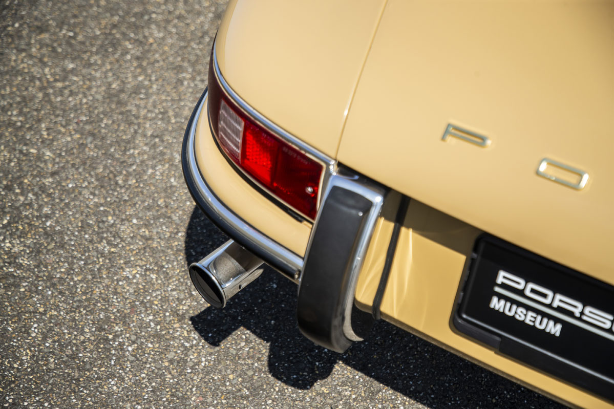 logo dorado Porsche 911 2.0 F Series (1964)Estéticamente hay que fijarse mucho para notar la diferencia entre los 911 cortos y los posteriores. Las proporciones visualmente son casi idénticas. Mi truco para reconocer unos y otros es fijarme en el tapón redondo que los 911 tienen delante del eje trasero y que sirve para poder acceder al ajuste de las barras de torsión traseras. En los de chasis corto se nota claramente que la distancia entre ese tapón y la base de la puerta es más pequeña. Si intentas apreciar esa diferencia de longitud fijándote en la ventanilla trasera o de otra forma, es mucho más difícil apreciarlo.
