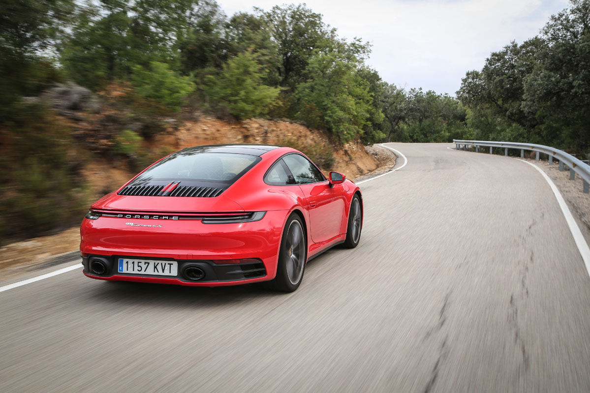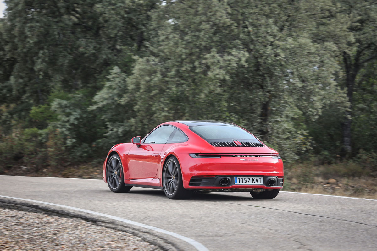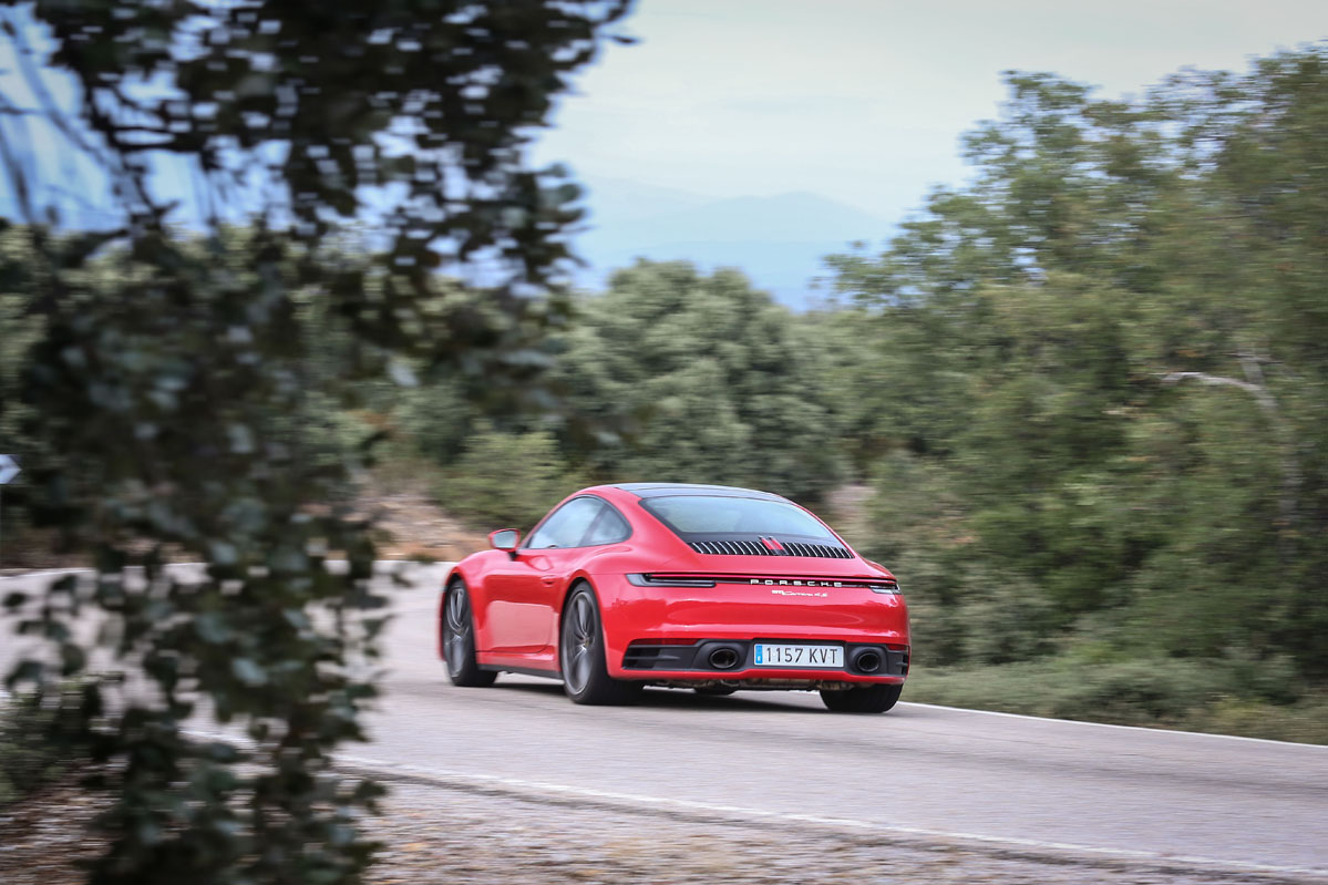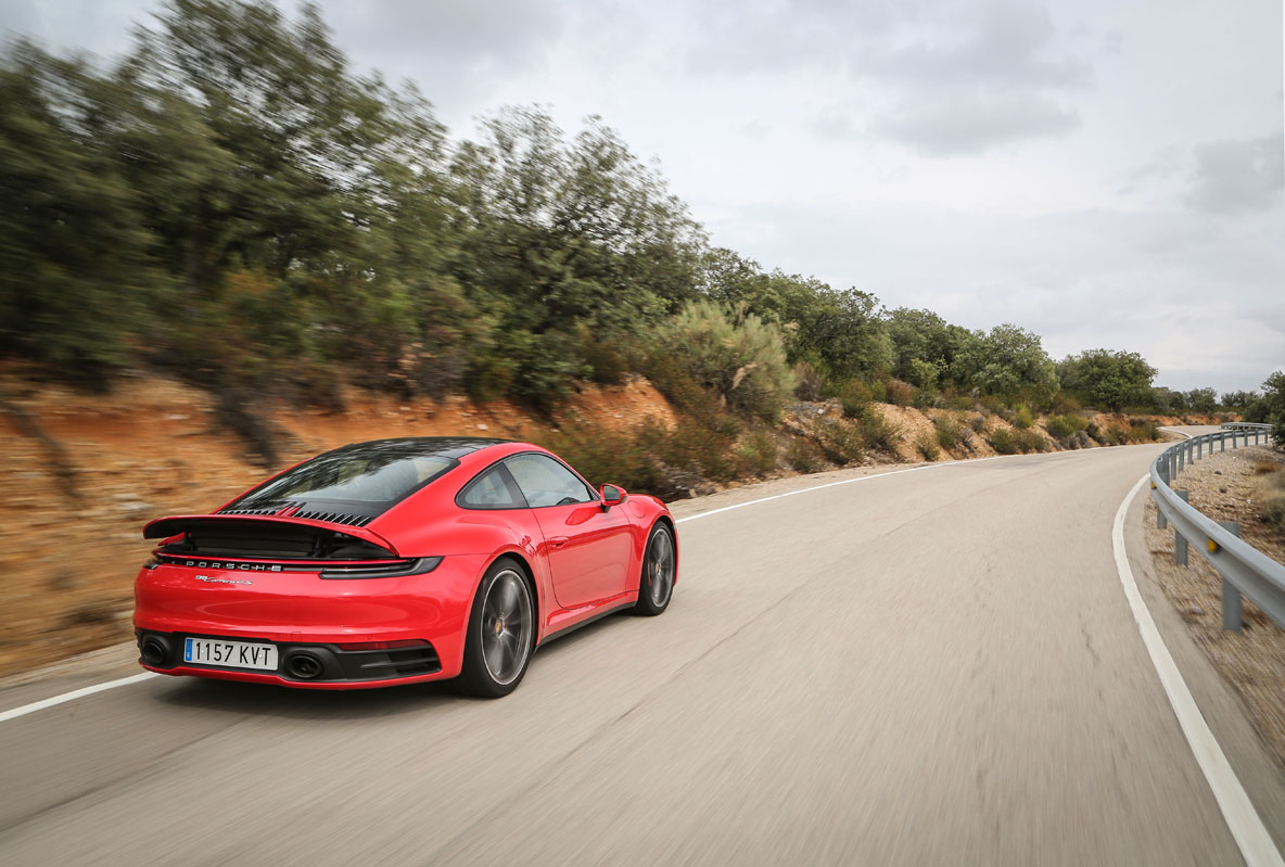 Continúo la prueba dinámica del Porsche 911 Coupé Carrera 4S 2019 en la autopista, tramo necesario para llegar al puerto de montaña que me espera. Modo Sport Plus activado. No me importa hacer kilómetros en recta, porque puedo ver la excelente aceleración de esta versión. Su bloque sobrealimentado 3.0 de 450 CV hace que este deportivo sea un misil tierra-tierra, y más con la función Sport Response, con la que el motor da el todo por el todo. Ofrece una aceleración brutal -el 0 a 100 km/h lo realiza en solo 3,6"-, aún más patente cuando la aguja pasa de las 2.300 rpm, momento en el que comienza a entregar su par máximo de 530 Nm, casi hasta el corte y sin el común lag de los motores turbo. También son vertiginosas las recuperaciones; da igual la marcha en la que se encuentre su raudo, eficaz y fiable cambio PDK de doble embrague y ocho marchas. Y todo ello, otra vez lo vuelvo a apostillar, acompañado de su sensacional sonido y de sus adrenalínicos petardeos de escape.