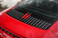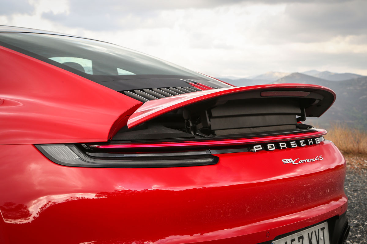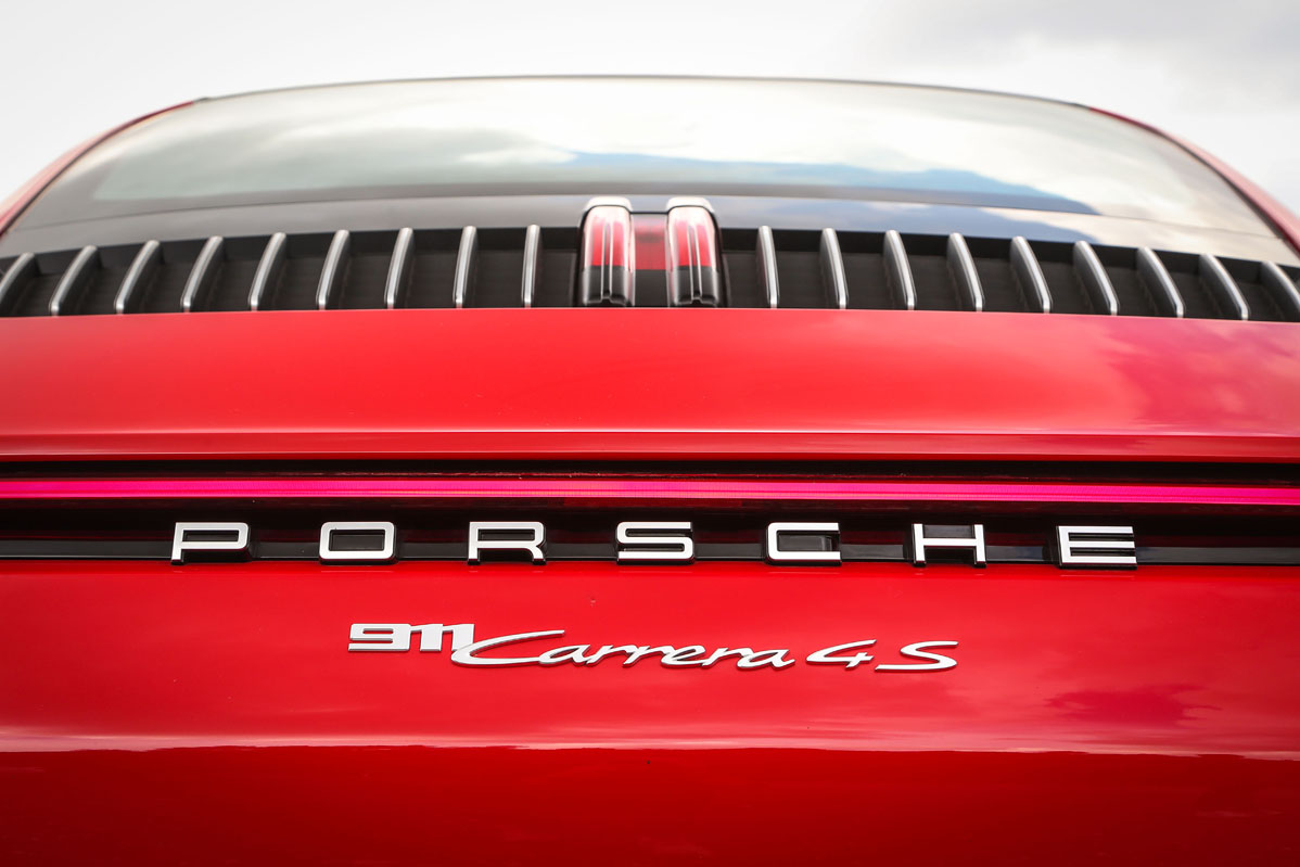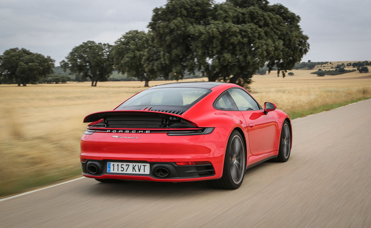 Y su zaga. Por muchas palabras que utilice para describirla, creo sería trabajo en vano. Es ancha, muy ancha, y toda ella es recorrida por una banda de diodos luminiscentes que consiguen que de noche sea espectacular, que lo hace inconfundible y que, no es tarea menor, incrementa la seguridad. La de freno y los intermitentes están insertadas en una concavidad en los extremos, confiriéndole una mayor sensación de anchura. Este mismo efecto también lo consigue la amplia moldura que recorre de forma transversal el paragolpes y que acoge las dos salidas ovaladas, una a cada lado, que enmarcan la matrícula, situada en una posición más baja que en los modelos previos. Otra acertada novedad es la rejilla del motor, formada por láminas verticales cromadas -los 'Nueveonce' de propulsión las adoptan negras- y que recoge, en el centro, la tercera luz de freno. El 992 equipa un nuevo alerón que es más aerodinámico, pero que estéticamente no me convence. La gran superficie en negro que descubre, desde mi punto de vista, rompe con el equilibrio que se ha conseguido. Lo puedo cerrar con tan solo tocar un botón. Tampoco pasa desapercibido el anagrama Porsche tridimensional, así como la tipografía de la versión del Porsche 911 de la prueba, Carrera 4S, que adopta el estilo utilizado por la firma de Stuttgart en la década de los 70.