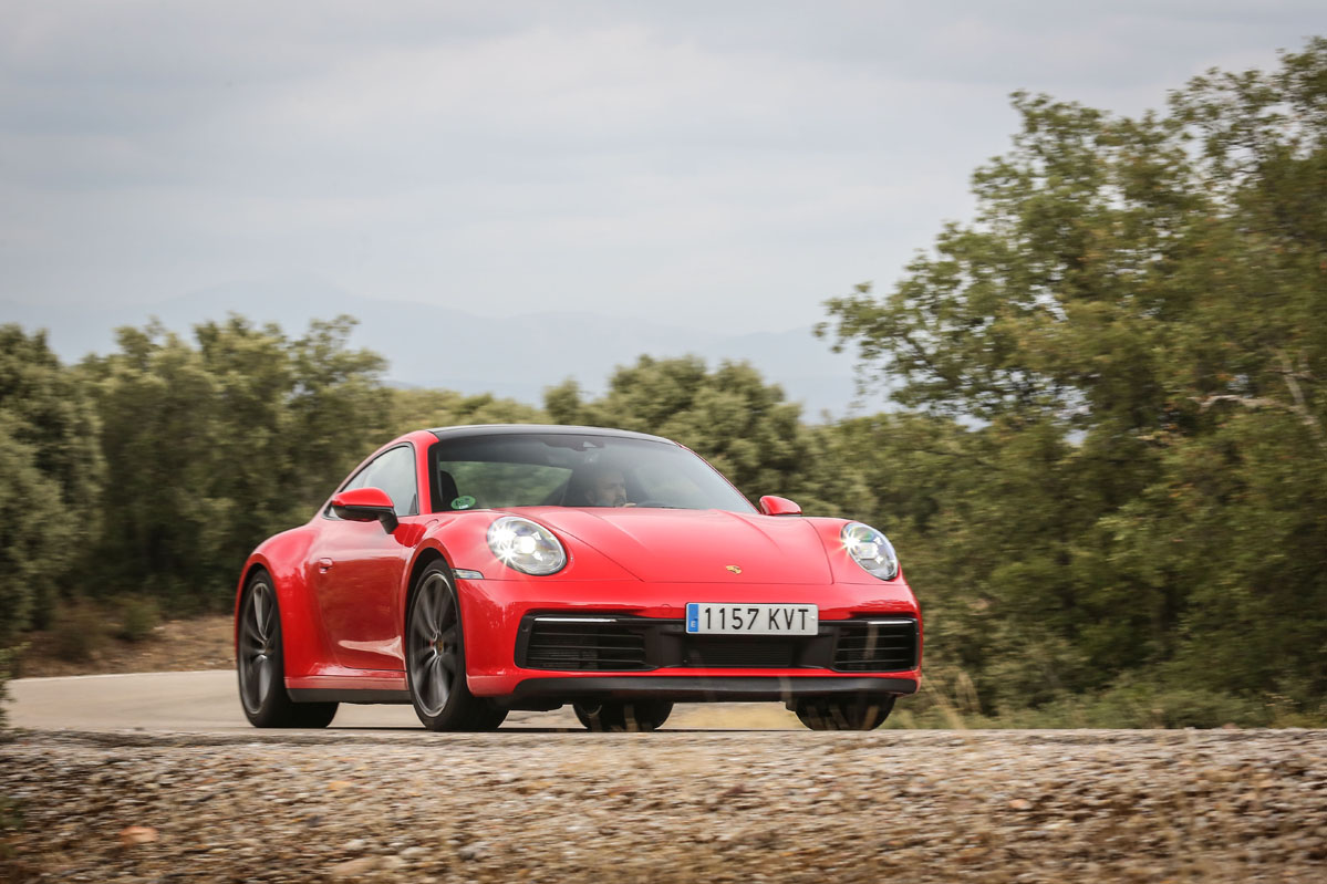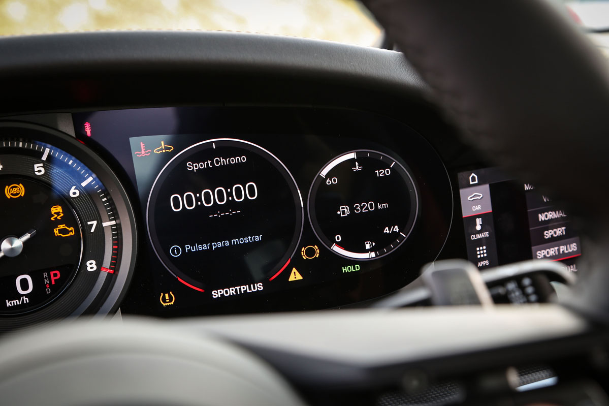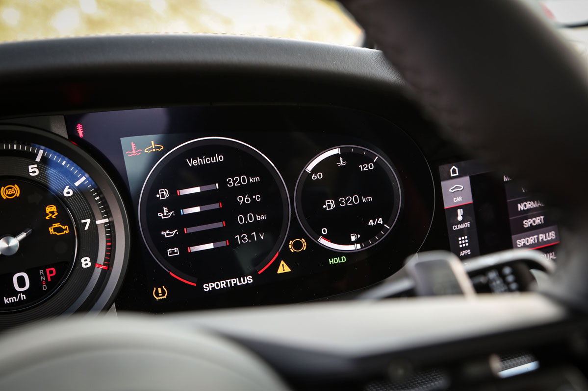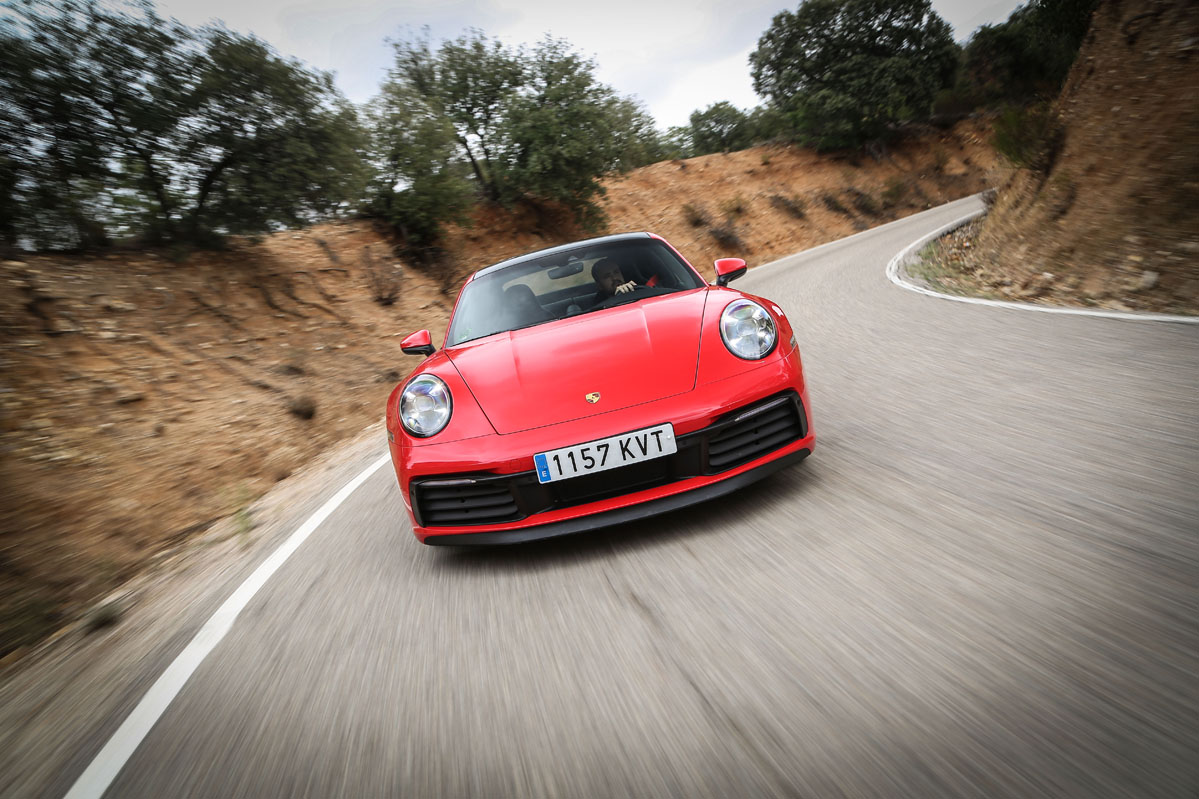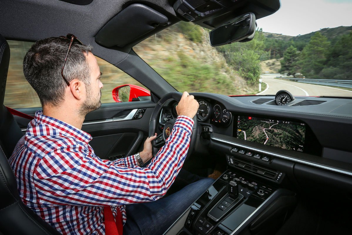 Es hora de conocer su interior. Me tiro al asiento, dejo la puerta abierta con toda la intención del mundo y mi mano izquierda gira el mando que por primera vez en un 911 sustituye a la llave. No hay sonido tan característico como el de un Porsche -quizá mi percepción cambie cuando pruebe el Taycan-. Ese gorgoteo de su motor bóxer es música para mis oídos... y para mis vecinos. Mientras los pistones trabajan de forma horizontal, mis ojos y mis manos repasan el interior. La compañía alemana ha sabido cómo modernizarlo. Lineas horizontales, perfectos ajustes y excelentes materiales, a excepción del plástico de los brazos del volante, que lo veo algo pobre. Las molduras de fibra de carbono que recubren la parte media del salpicadero hacen que gane muchos más enteros respecto a las de plástico gris oscuro que equipaba el Porsche 911 992 S Cabriolet que probé en la presentación internacional y que no me dejaron un buen sabor de boca. Sí lo ha vuelto a hacer el cuadro de instrumentos, que integra dos pantallas de 7 pulgadas que simulan las clásicas esferas del 911, con el cuentarrevoluciones analógico, bien grande, en el centro. También la enorme pantalla táctil de 10,9 pulgadas del PCM que sorprende por su magnífica resolución. Asimismo, la consola central también aúna lo clásico, representado por botones analógicos, con lo más moderno, ejecutado mediante un panel táctil. En él se sitúa la palanca del cambio PDK, que ha visto como se ha reducido en tamaño a la vez que ha perdido en atractivo. Mis manos agarran el aro para confirmar que tiene un diámetro -360 milímetros- y un grosor perfecto. ¡Chapó!