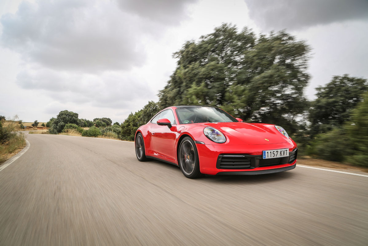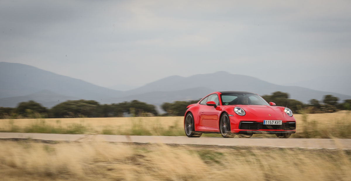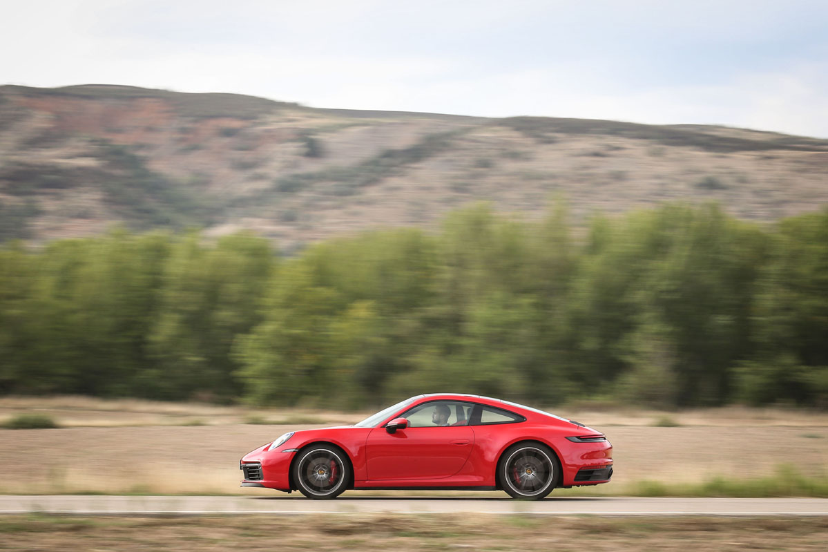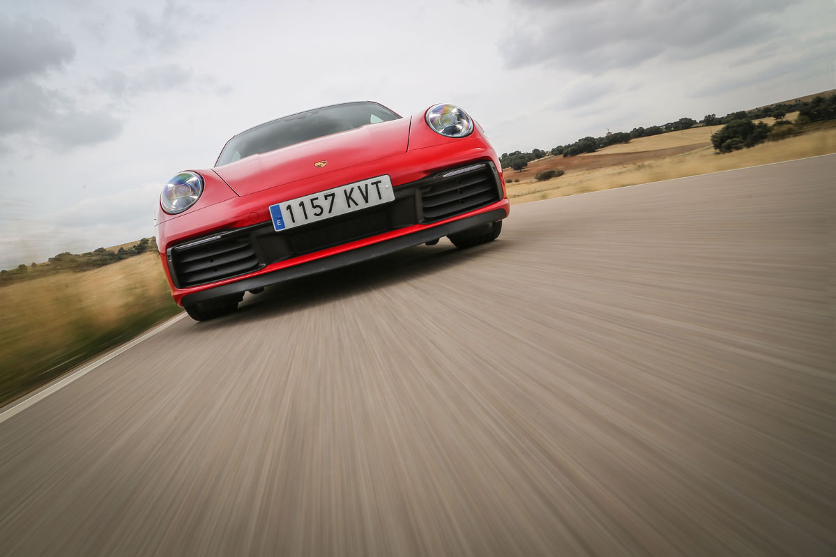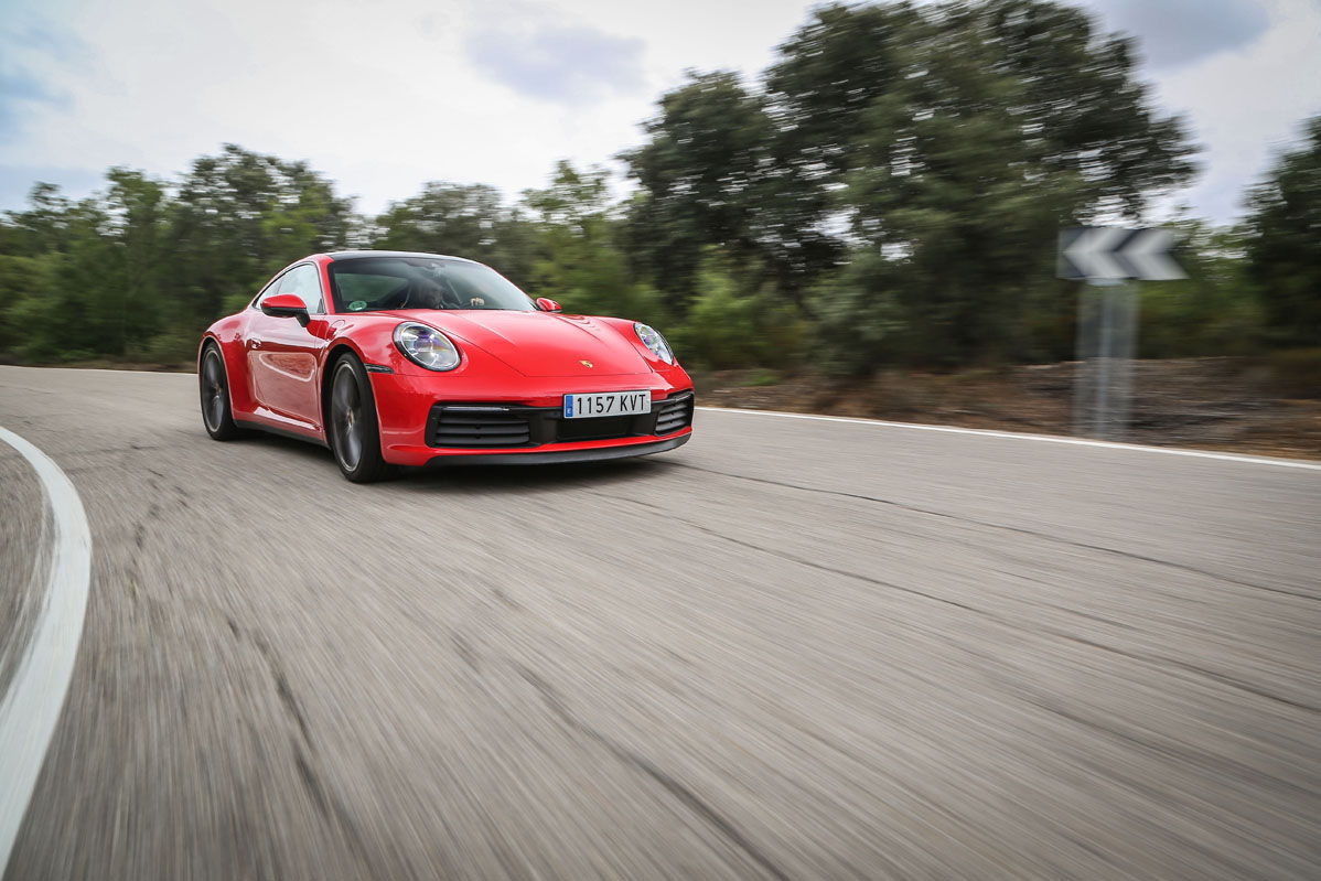 Es hora de conocer su interior. Me tiro al asiento, dejo la puerta abierta con toda la intención del mundo y mi mano izquierda gira el mando que por primera vez en un 911 sustituye a la llave. No hay sonido tan característico como el de un Porsche -quizá mi percepción cambie cuando pruebe el Taycan-. Ese gorgoteo de su motor bóxer es música para mis oídos... y para mis vecinos. Mientras los pistones trabajan de forma horizontal, mis ojos y mis manos repasan el interior. La compañía alemana ha sabido cómo modernizarlo. Lineas horizontales, perfectos ajustes y excelentes materiales, a excepción del plástico de los brazos del volante, que lo veo algo pobre. Las molduras de fibra de carbono que recubren la parte media del salpicadero hacen que gane muchos más enteros respecto a las de plástico gris oscuro que equipaba el Porsche 911 992 S Cabriolet que probé en la presentación internacional y que no me dejaron un buen sabor de boca. Sí lo ha vuelto a hacer el cuadro de instrumentos, que integra dos pantallas de 7 pulgadas que simulan las clásicas esferas del 911, con el cuentarrevoluciones analógico, bien grande, en el centro. También la enorme pantalla táctil de 10,9 pulgadas del PCM que sorprende por su magnífica resolución. Asimismo, la consola central también aúna lo clásico, representado por botones analógicos, con lo más moderno, ejecutado mediante un panel táctil. En él se sitúa la palanca del cambio PDK, que ha visto como se ha reducido en tamaño a la vez que ha perdido en atractivo. Mis manos agarran el aro para confirmar que tiene un diámetro -360 milímetros- y un grosor perfecto. ¡Chapó!