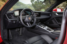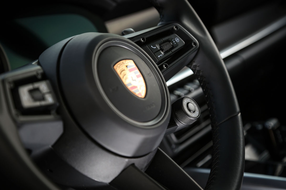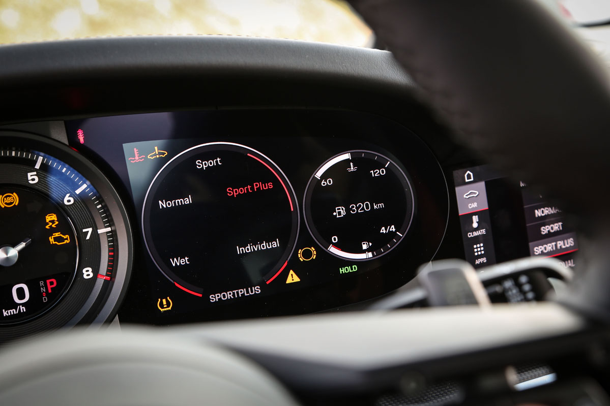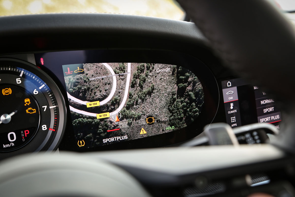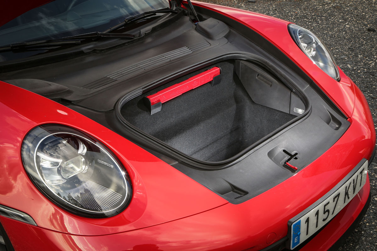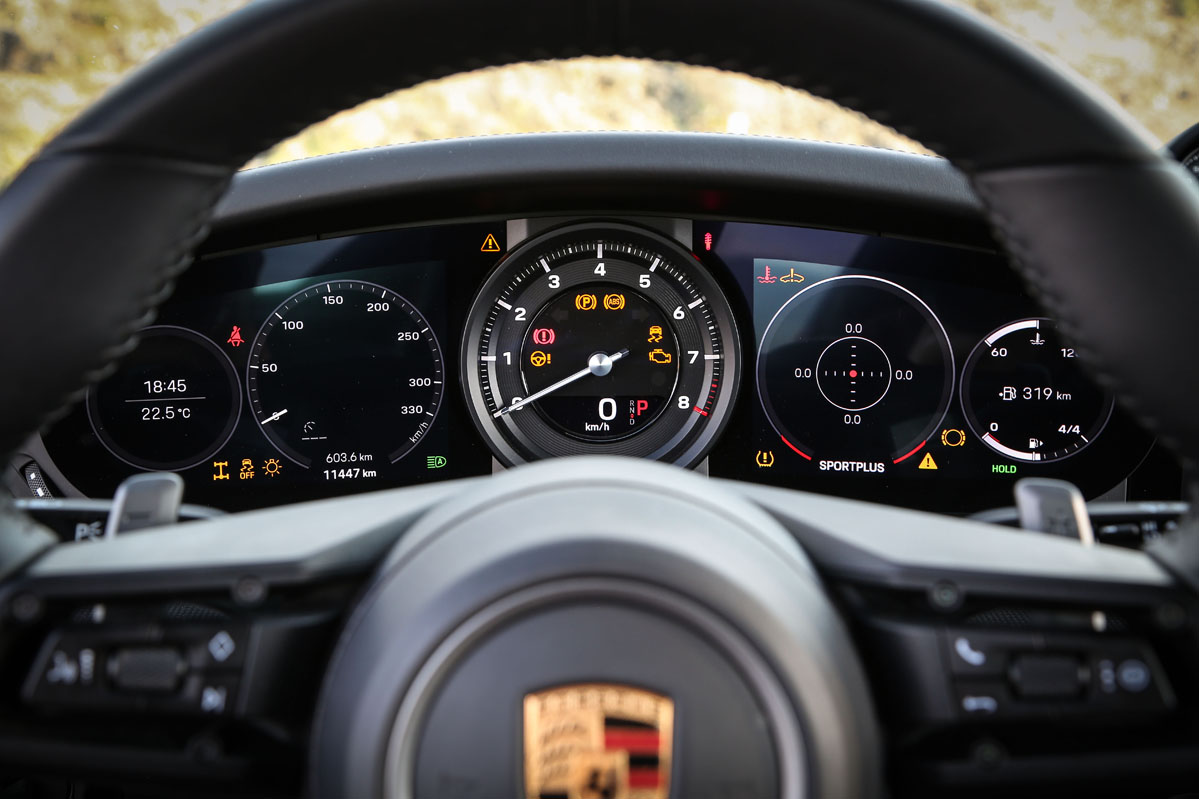 Es hora de conocer su interior. Me tiro al asiento, dejo la puerta abierta con toda la intención del mundo y mi mano izquierda gira el mando que por primera vez en un 911 sustituye a la llave. No hay sonido tan característico como el de un Porsche -quizá mi percepción cambie cuando pruebe el Taycan-. Ese gorgoteo de su motor bóxer es música para mis oídos... y para mis vecinos. Mientras los pistones trabajan de forma horizontal, mis ojos y mis manos repasan el interior. La compañía alemana ha sabido cómo modernizarlo. Lineas horizontales, perfectos ajustes y excelentes materiales, a excepción del plástico de los brazos del volante, que lo veo algo pobre. Las molduras de fibra de carbono que recubren la parte media del salpicadero hacen que gane muchos más enteros respecto a las de plástico gris oscuro que equipaba el Porsche 911 992 S Cabriolet que probé en la presentación internacional y que no me dejaron un buen sabor de boca. Sí lo ha vuelto a hacer el cuadro de instrumentos, que integra dos pantallas de 7 pulgadas que simulan las clásicas esferas del 911, con el cuentarrevoluciones analógico, bien grande, en el centro. También la enorme pantalla táctil de 10,9 pulgadas del PCM que sorprende por su magnífica resolución. Asimismo, la consola central también aúna lo clásico, representado por botones analógicos, con lo más moderno, ejecutado mediante un panel táctil. En él se sitúa la palanca del cambio PDK, que ha visto como se ha reducido en tamaño a la vez que ha perdido en atractivo. Mis manos agarran el aro para confirmar que tiene un diámetro -360 milímetros- y un grosor perfecto. ¡Chapó!
