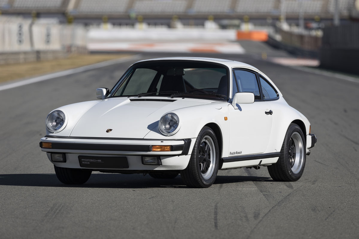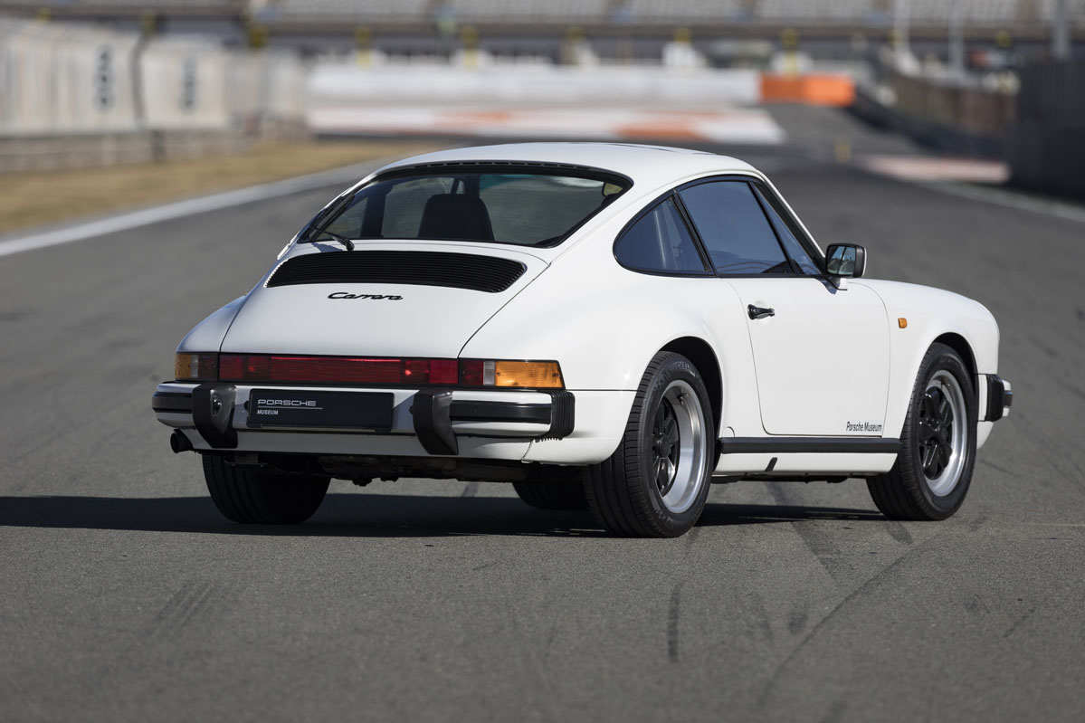 Imagen dinámica trasera del Porsche 911 G 3.2 en blanco