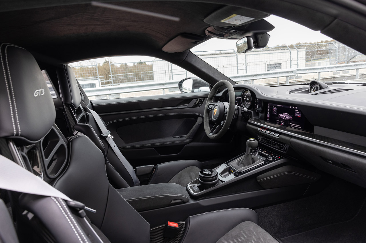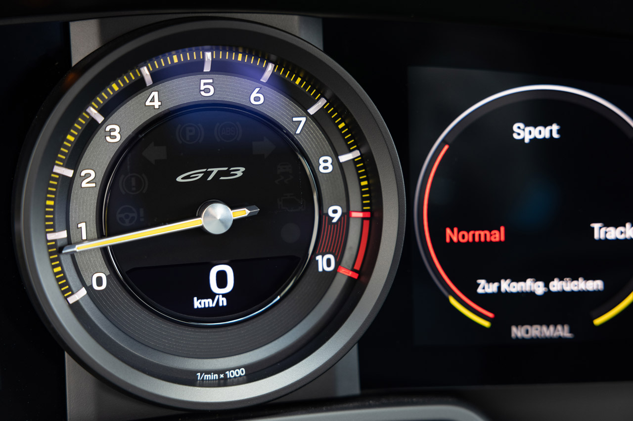 ¿Pero quién quiere ir tranquilo con semejante deportivo entre manos? El sonido, el tacto directo, la respuesta inmediata que te pega al asiento, todo en el GT3 invita a disfrutar. A pesar de su precisión, de su nivel muy por encima de tus cualidades, es lo que hace que sea un Porsche con mayúsculas. Todos esos avances y herencias de la competición dispuestos no solo a marcar mejores tiempos si lo metemos en circuito, sino a que nos sintamos más a gusto con él yendo rápido en carretera, o incluso de paseo, subiendo y bajando marchas por mero placer, estirando su cuentarrevoluciones hasta la zona roja o viendo por el retrovisor su alerón de cuello de cisne sustentado por su sensual carrocería.