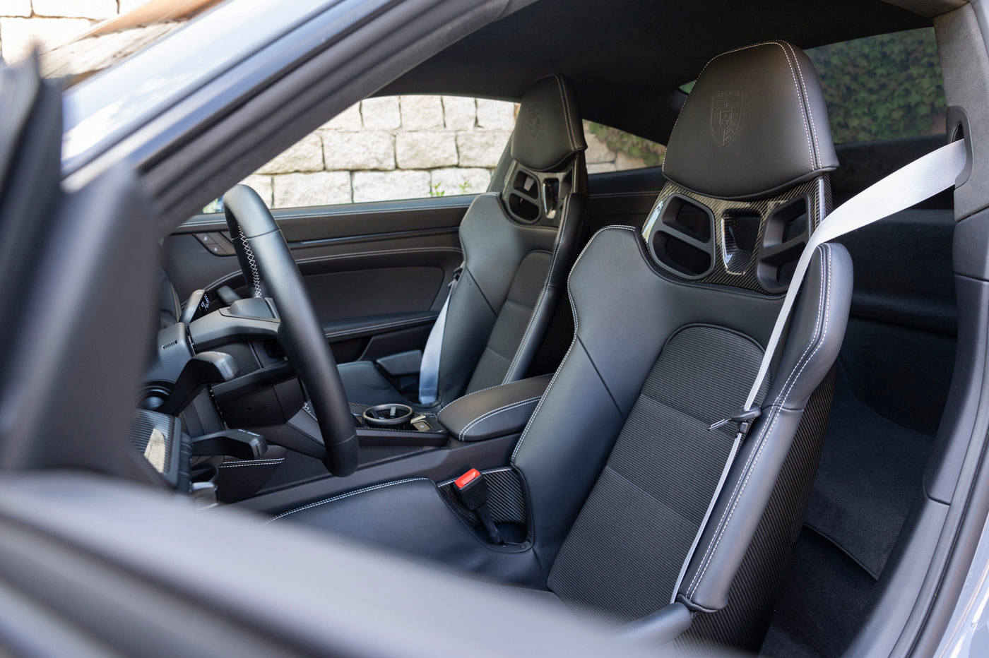 Detrás de mi espalda, ningún asiento. Todo para aligerar el conjunto -en la actualización se pueden equipar dos banquetas-. Y es que, no solo de estética vive el GT3 Touring, porque los 1.418 kg de esta versión manual se consiguen con un capó de plástico reforzado con fibra de carbono (CFRP), unas ventanillas de cristal ligero, unas llantas de aleación forjada y un escape más liviano.