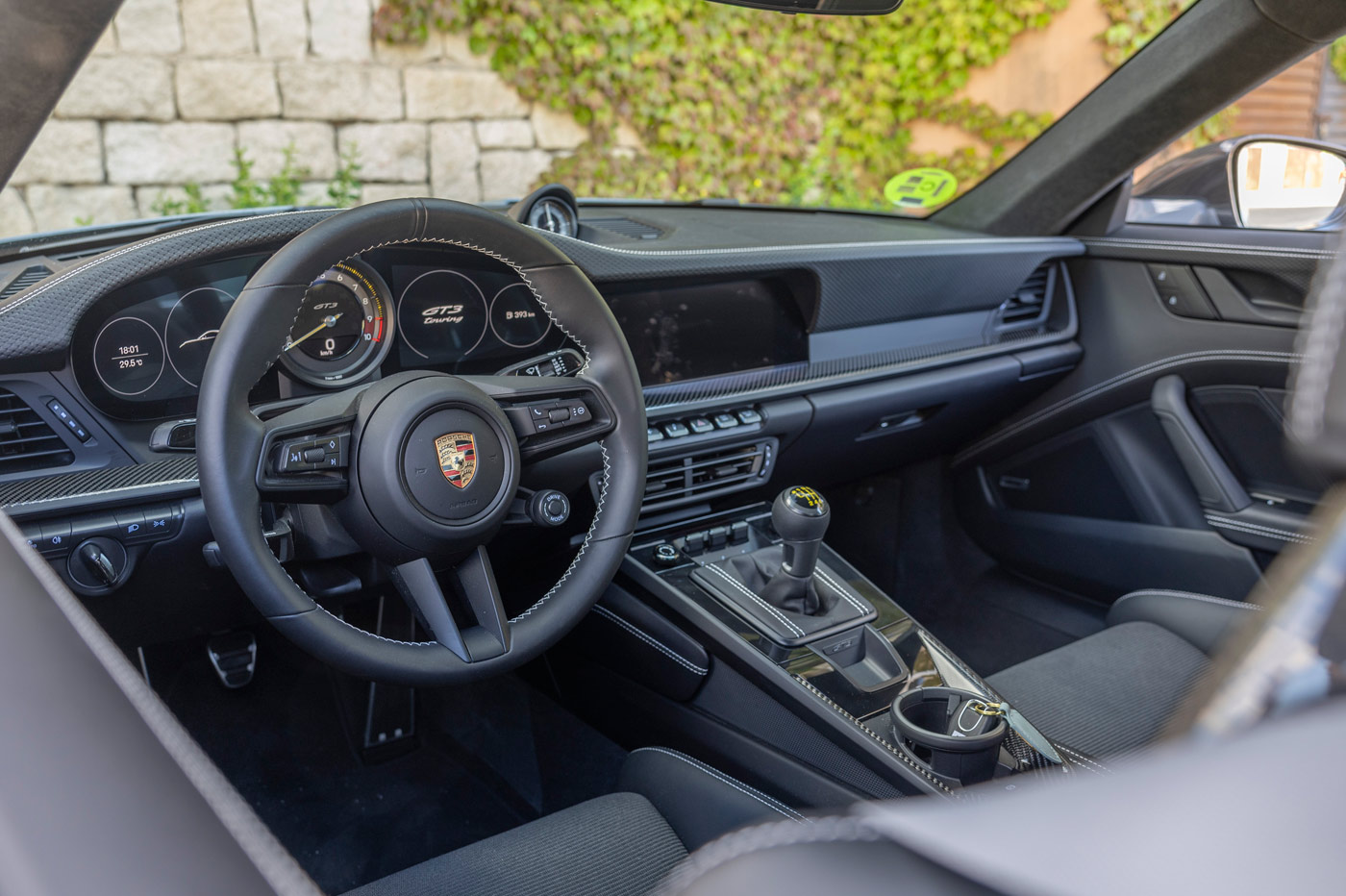 Conducir este Porsche 911 GT3 Touring son sensaciones puras al volante. Y a ello contribuye el sonido del motor atmosférico que se cuela en el habitáculo, pero también el del cambio manual o el de las chinas del asfalto que son lanzadas con virulencia a los bajos y los guardabarros del deportivo.