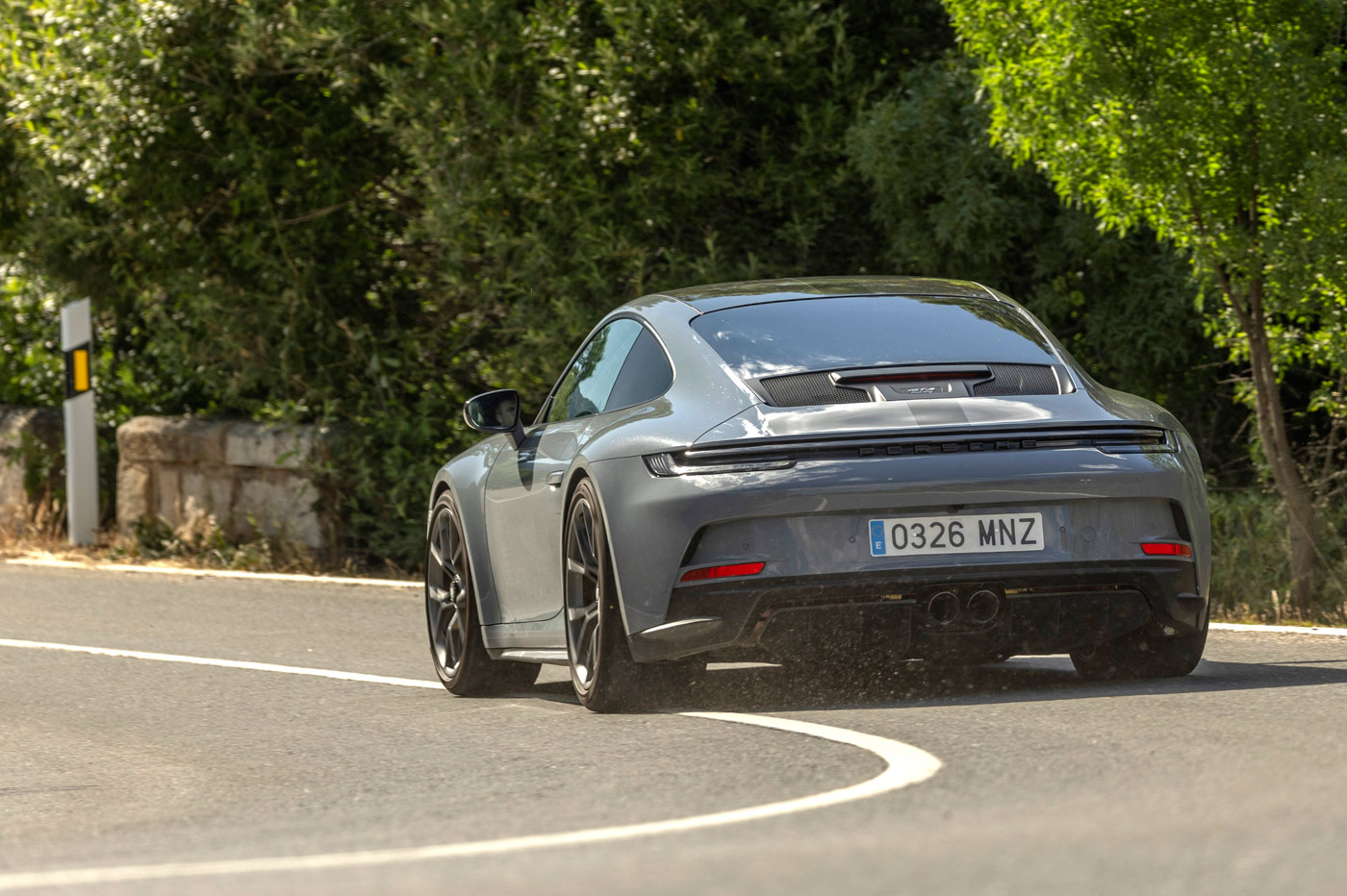 Da igual si son curvas cerradas o curvas abiertas, porque su paso por ellas es rapidísimo. ¡Cómo se agarra al asfalto! Parte de culpa la tienen los neumáticos Pirelli P Zero Corsa y la suspensión delantera de dobles brazos transversales, que proviene del Porsche 911 RSR, el de competición, con lo que mejora, aún más, su comportamiento. De hecho, es el primer Porsche 911 que deja de lado los McPherson.