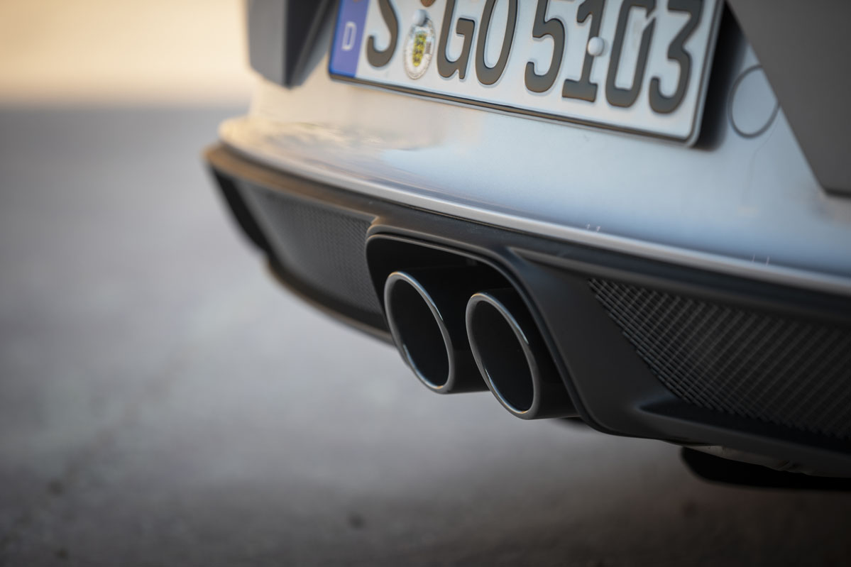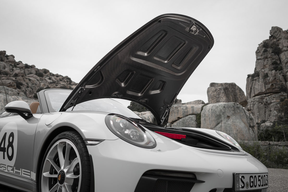 De hecho, podría decirse que es la variante descapotable del GT3, porque su puesta a punto es muy similar y comparten multitud de componentes, incluido el motor bóxer de seis cilindros atmosférico, si bien, en esta ocasión ha sido revisado para cumplir con la última normativa de emisiones europea y, de paso, elevar su potencia hasta los 510 caballos. Los cambios afectan al sistema de admisión, a los inyectores y al escape, que está fabricado en acero inoxidable y es 10 kilos más ligero que el del GT3, pese a que incorpora un filtro de partículas para reducir las emisiones. ¿Significa esto que suena menos o peor? Basta con arrancar el motor para responder a esa pregunta con un no rotundo.
