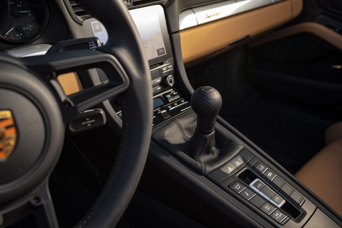 Desde el instante en el que el bloque de 4.0 litros cobra vida, la sinfonía mecánica es espectacular. En pleno auge de los escapes falsos y el sonido amplificado por altavoces, escuchar un seis cilindros bóxer atmosférico en todo su esplendor es un auténtico placer. A decir verdad, todo en este 911 recuerda a los coches de antes, es uno de los últimos deportivos puros y precisamente eso es lo que lo convierte en uno de las alternativas más divertidas de las últimas décadas. El mejor ejemplo de esa pureza es su cambio manual; prácticamente ningún coche actual con más de 300 CV apuesta por este tipo de transmisión y todavía es más complicado encontrar un supercar con tres pedales, pero Porsche no lo dudó ni un instante y cada una de las 1.948 unidades del Speedster incorporan una caja de cambios manual de seis velocidades.