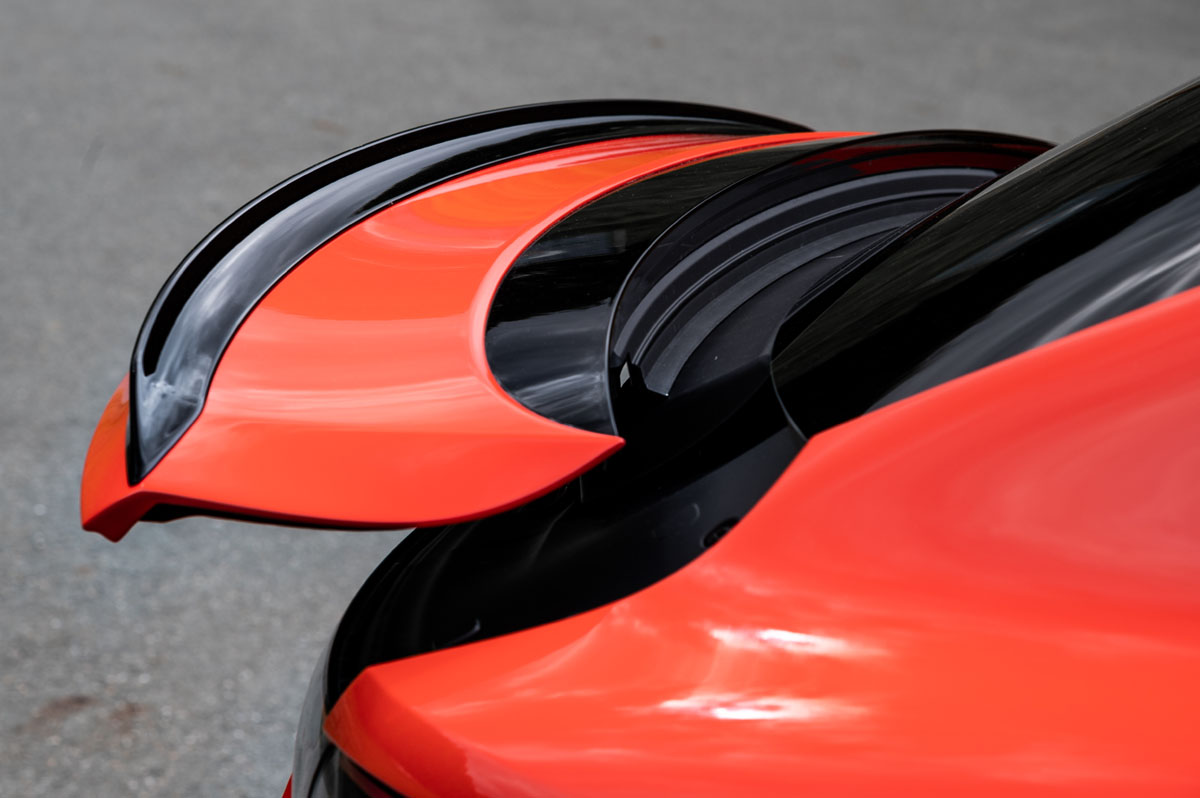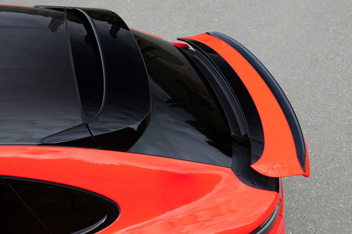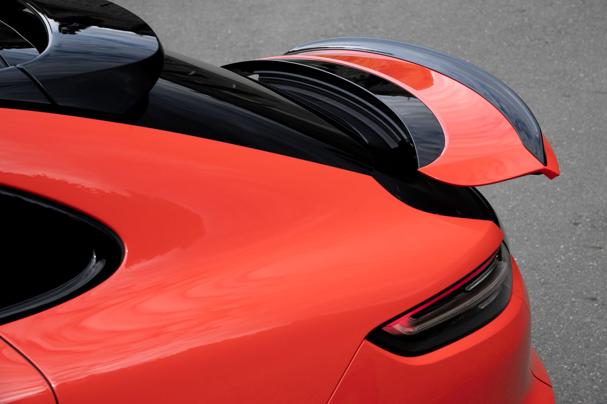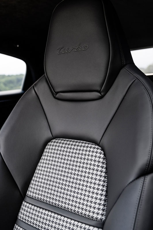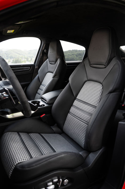 Respecto a la segunda fila, el cliente puede elegir por el mismo precio, cero euros, dos o tres asientos. Independientemente de la selección, el espacio para las piernas es grande, y el reservado a la cabeza, también. En mi caso, que mido 1,78 m, son unos tres dedos y medio los que me separan de rozar con el techo; da igual si equipa el panorámico, que es de serie, o no. ¿Y cómo ha conseguido Porsche ofrecer un espacio considerable con un techo de caída pronunciada? Pues añadiendo una doble burbuja y, sobre todo, rebajado la altura de las banquetas en 30 mm -esta variación impide que se muevan de forma longitudinal, aunque los respaldos sí mantienen la posibilidad de inclinarlos hasta dos grados en diez posiciones-. Volviendo al techo, que es el mayor reto que ha tenido la marca en el desarrollo del vehículo, según me comenta un ingeniero en la presentación internacional: puede ser panorámico de cristal con una superficie de 2,16 m2, incrementando la sensación de amplitud en el habitáculo, o estar realizado en fibra de carbono, restando 21 kilogramos al conjunto -otro elemento más del paquete deportivo ligero-.