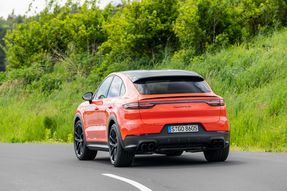 Pero también he podido realizar la prueba del Porsche Cayenne Turbo Coupé, la versión más bestia gracias a su V8 de 550 CV. El sonido es diferente, donde el borboteo es el protagonista -puedes reducirlo a golpe de botón-, y, obviamente, su respuesta, también. Empuja de forma brutal, desde bien abajo y hasta el final de la zona roja; no es para menos tratándose de 550 CV y de 700 Nm de par. Su transmisión ejecuta el cambio de transición con un leve tirón -en modo Sport- y con suma facilidad y rapidez, a pesar de tratarse de uno de convertidor de par de ocho velocidades y no de uno de doble embrague, tipo de cambio que para nada echo en falta. Este maridaje perfecto hace que el Turbo Coupé acelere de 0 a 100 km/h en solo 3,9" y que alcance los 286 km/h. Y para que el consumo sea menor, equipa el sistema de desconexión de cilindros, que no percibo cuándo interviene.