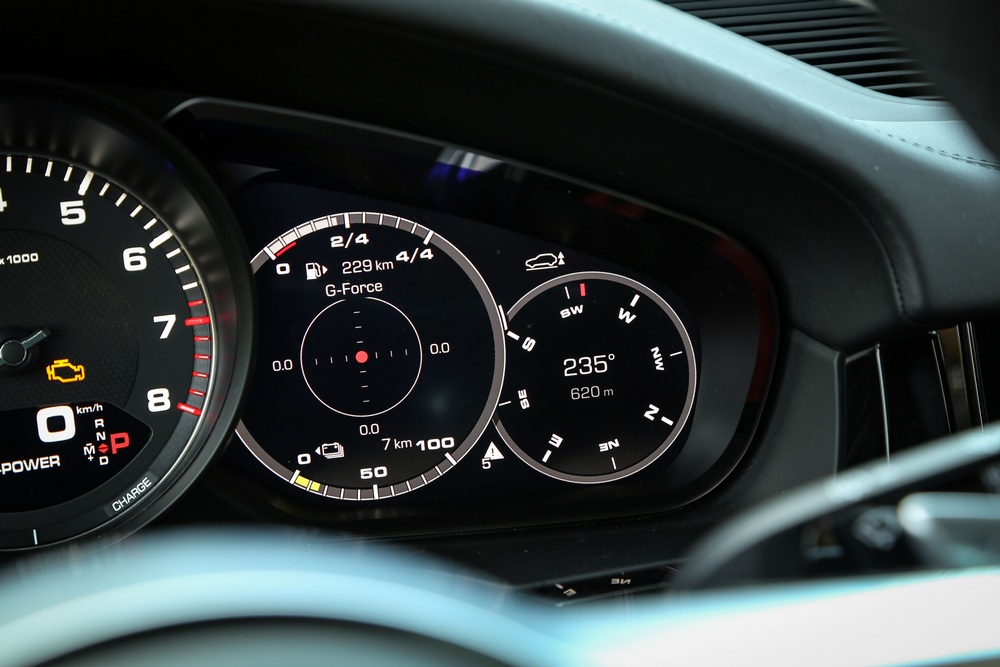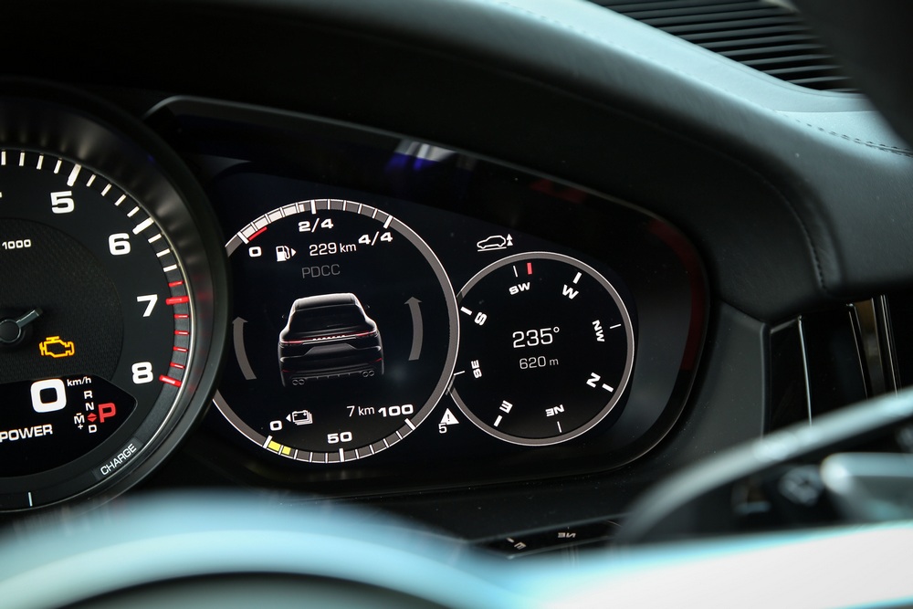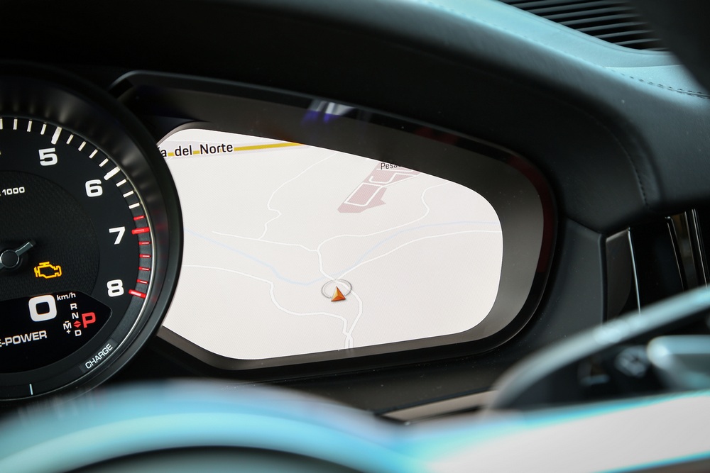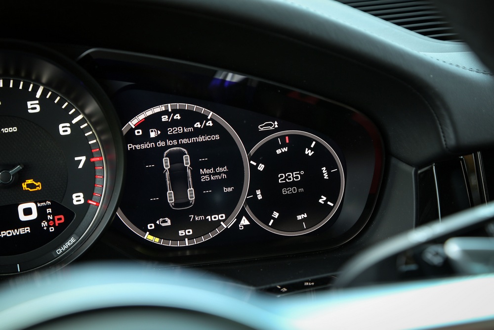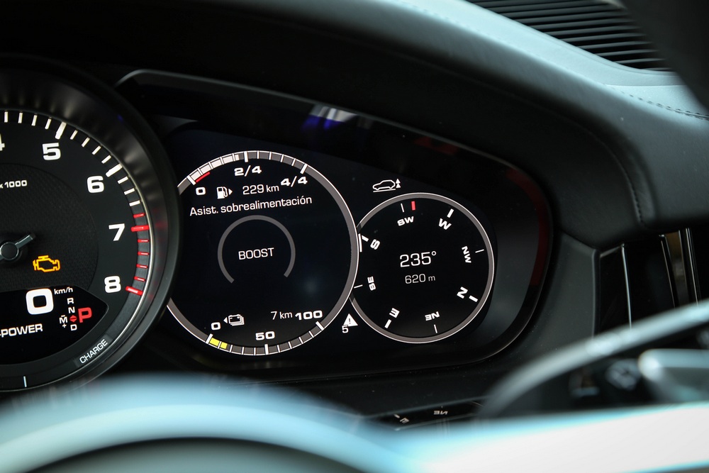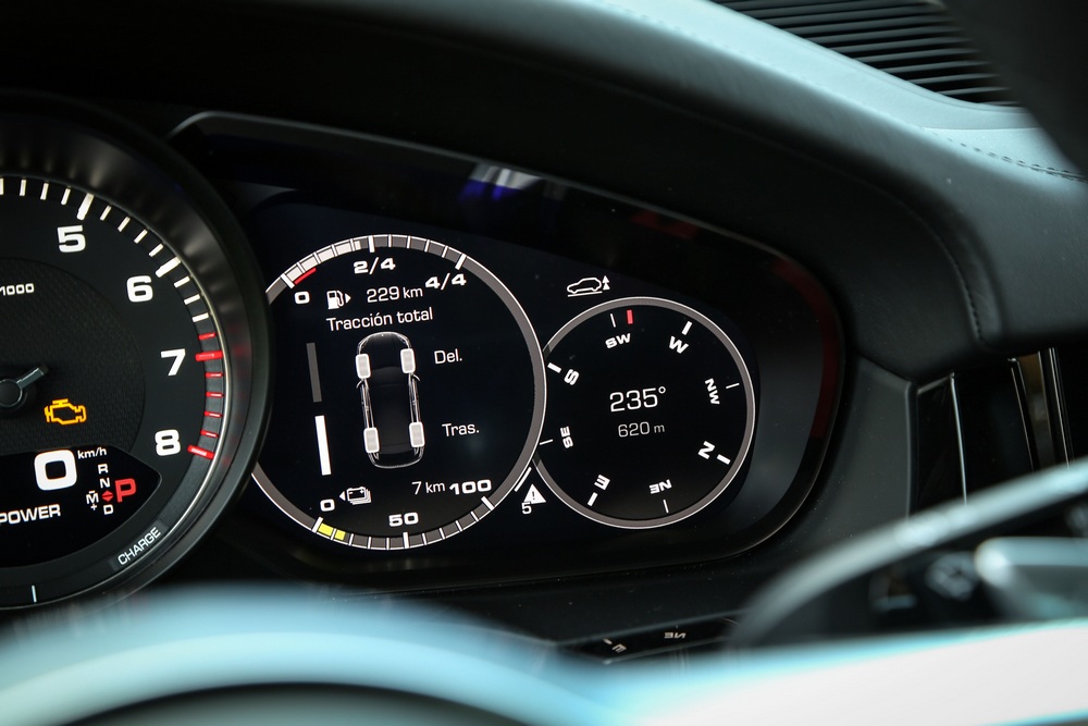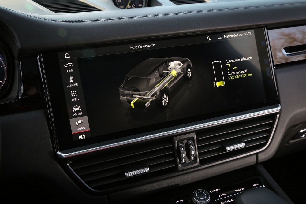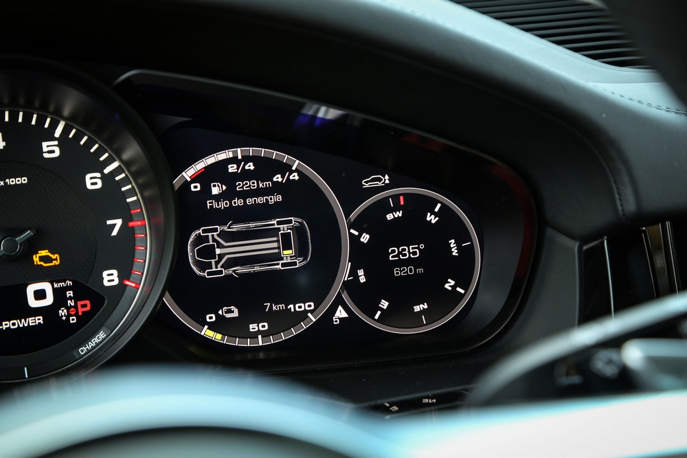 El habitáculo del Porsche Cayenne E-Hybrid, como sus hermanos de gama, es un espacio que aúna tradición, abundante tecnología y que rezuma lujo. Es tradicional porque su diseño sigue las pautas de todos los vehículos de Porsche, con un cuadro de mandos dominado por un tacómetro analógico ubicado en posición central. Y es tecnológico porque, por ejemplo, a ambos lados del cuentavueltas nos encontramos con dos pantallas de alta definición de 7 pulgadas que proporcionan gran cantidad de información.