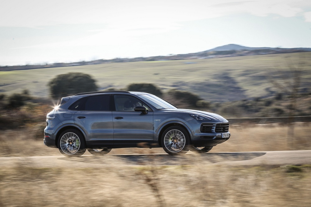 La suspensión neumática de tres cámaras (2.172 euros), las barras estabilizadoras activas (3.328 euros), el sistema de dirección a las cuatro ruedas (2.082 euros)… todos estos elementos opcionales convierten al Cayenne E-Hybrid en un SUV tremendamente ágil. Tanto es así que al volante tienes la sensación de estar conduciendo un vehículo de la mitad de peso. No balancea al acelerar, frenar o en fuertes apoyos; tiene una dirección rápida y un equipo de frenos muy potente incluso sin recurrir a los discos opcionales con recubrimiento de carburo de tungsteno (3.025 euros) o a los cerámicos reforzados con fibra de carbono (9.088 euros).
