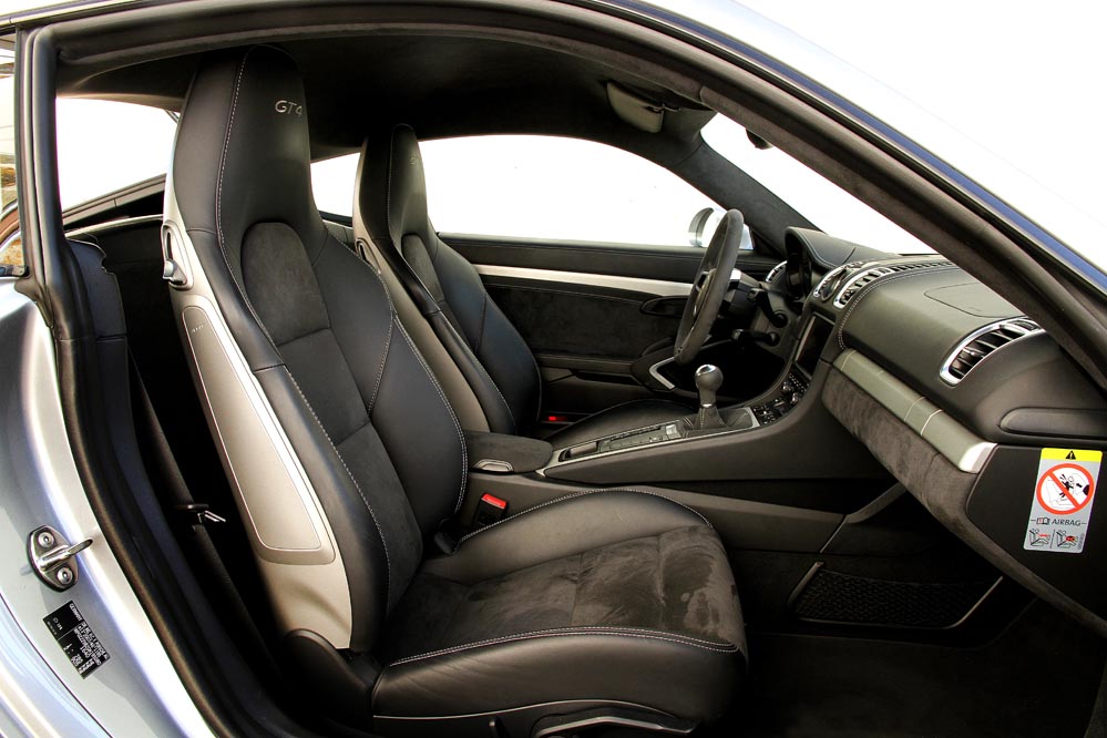El habitáculo está forrado casi por completo en Alcantara, por lo que el aroma a competición es aún más palpable. El volante, de diámetro y grosor perfecto, y los asientos, confortables y que sujetan realmente bien el cuerpo, también están tapizados en piel vuelta. Gracias a la configuración de las banquetas y a que la distancia al suelo de la carrocería es 30 milímetros menor, encuentro una posición de conducción que roza la perfección y en la que mi trasero casi puede sentir el suelo. A pesar de esta característica, la cual considero una ventaja, el acceso a las banquetas es cómodo y la visibilidad es bastante buena, siempre y cuando seas consciente de lo que lo que tienes entre manos es un coupé biplaza.