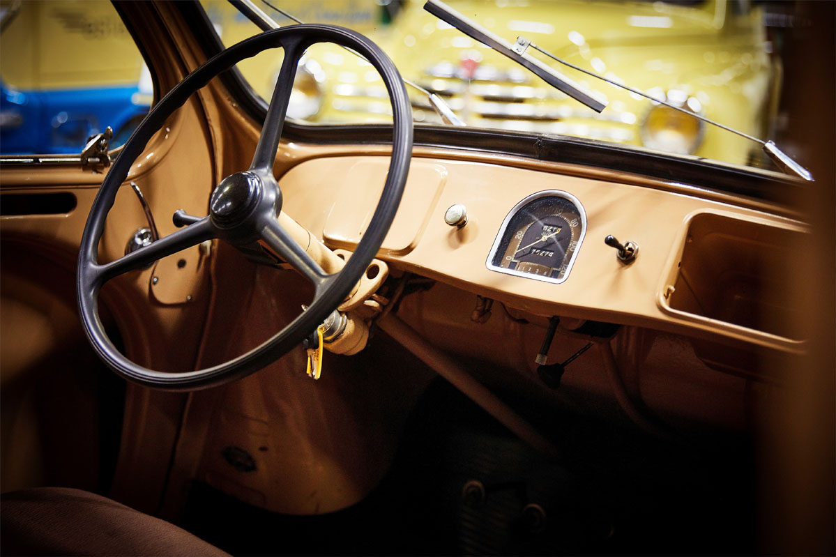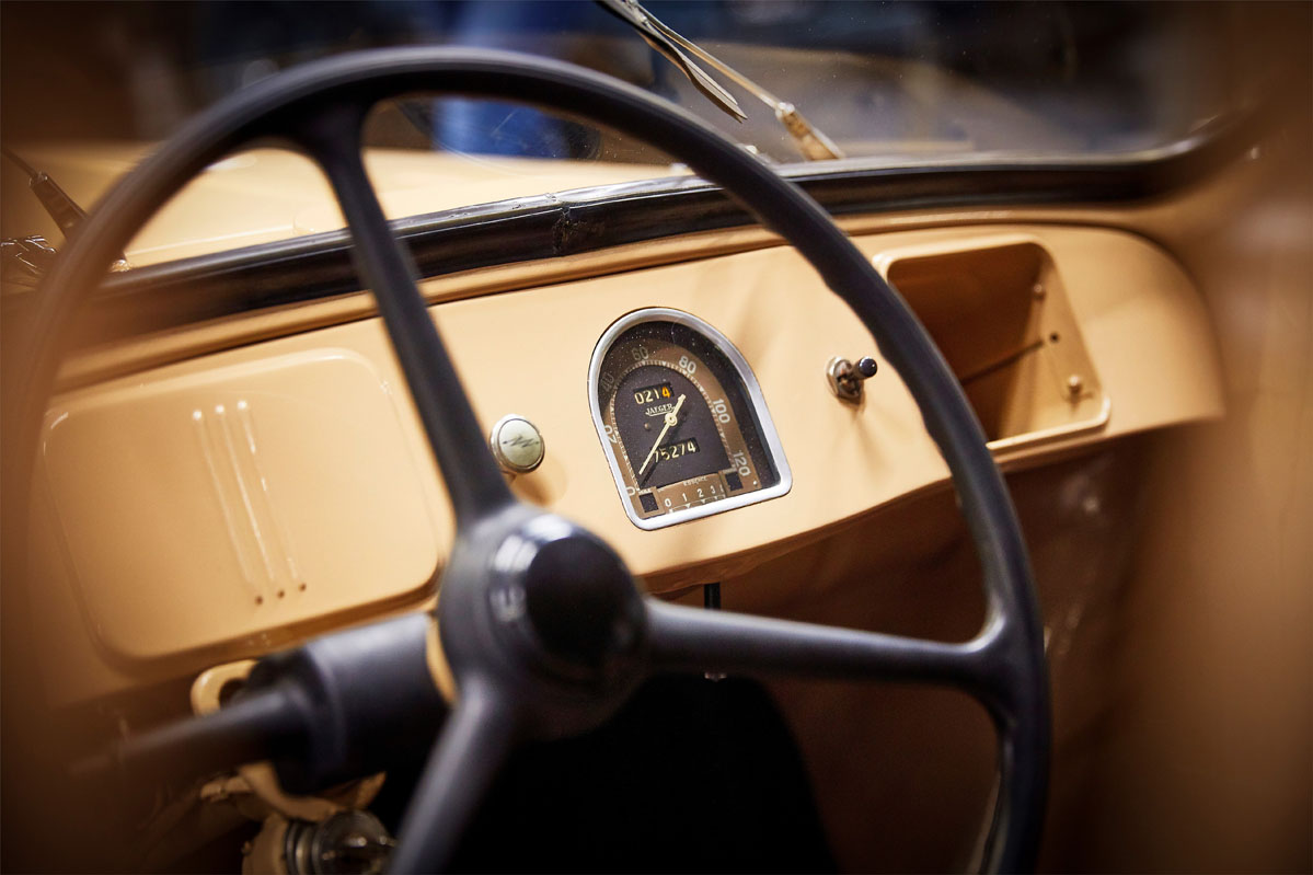 Al abrir las puertas delanteras, que son de tipo suicida a contra marcha, te encuentras con un interior que los modernos definirían como “minimalista”, pero yo prefiero llamarlo espartano. Carece de todo lo prescindible. Tiene dos asientos delante, una banqueta trasera, un volante, los mandos de luces y limpiaparabrisas, velocímetro, palanca de cambios, pedales y nada más. Ni siquiera la guantera tiene tapa.