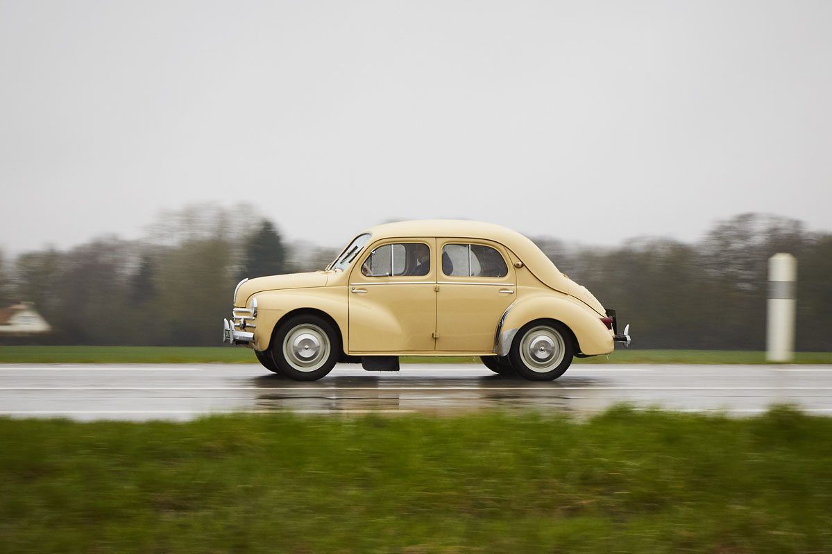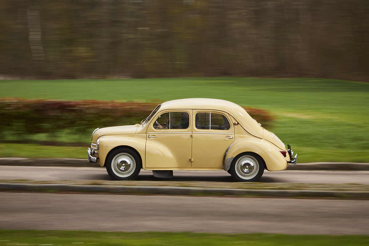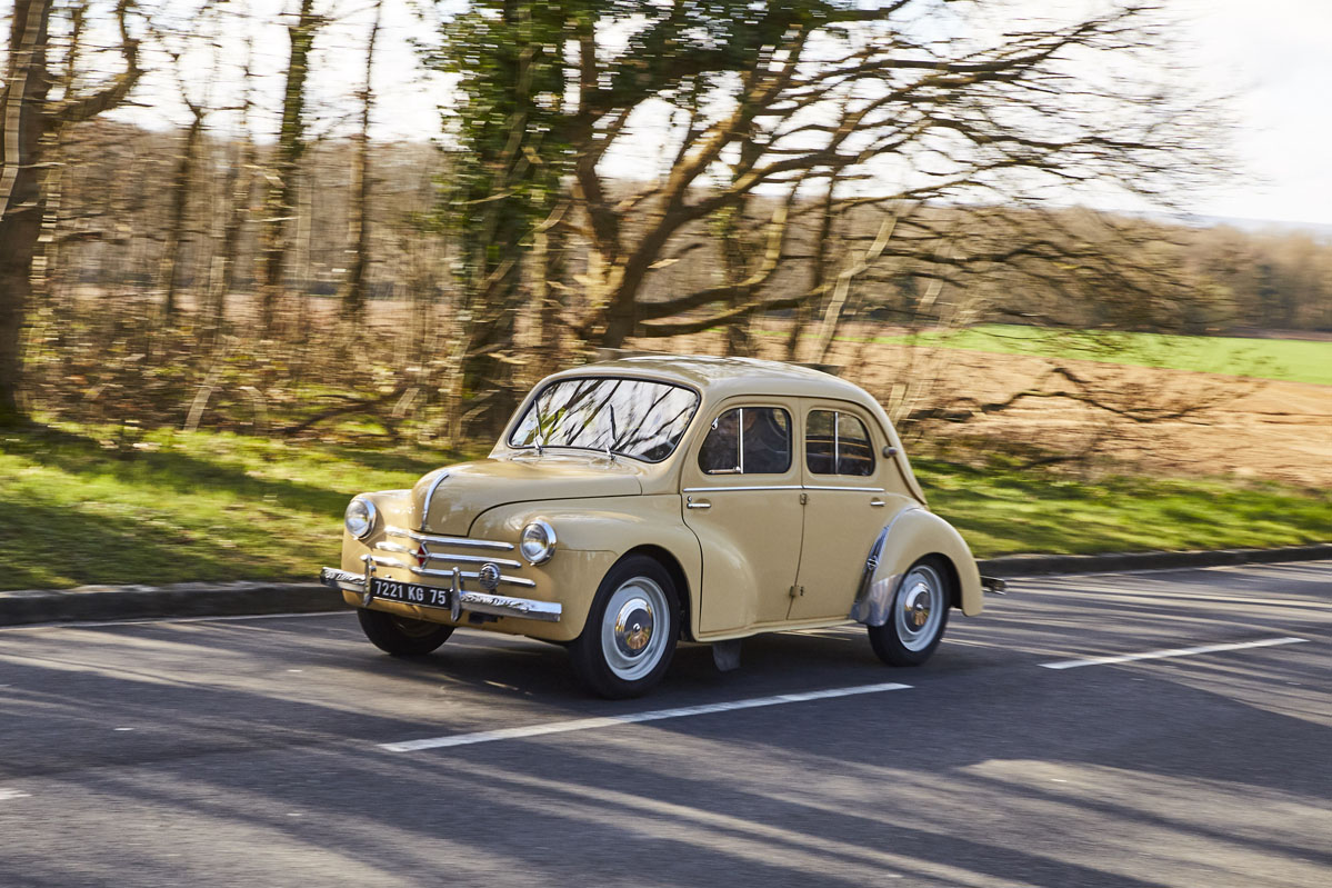 Los de Renault no se rompieron mucho la cabeza poniéndole nombre a su nuevo modelo. Simplemente lo bautizaron haciendo referencia a su potencia fiscal, 4CV, resultante de aplicar la fórmula empleada por las autoridades francesas sobre la cilindrada de su mecánica de 4 cilindros en línea de 747 cm3 colocado por detrás del eje trasero longitudinalmente.