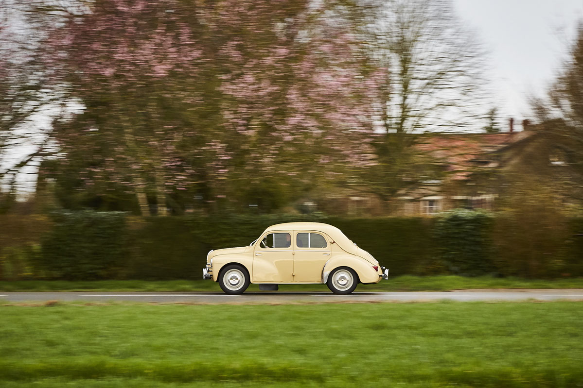 El sonido del motor es muy evocador y el Renault 4/4 tiene una conducción muy agradable y diferente a lo que estamos acostumbrados. La verdad es que no va nada mal y empiezo a entender que Alpine lograse hacer de él un coche ganador en competiciones deportivas en su categoría. Me resulta mucho más agradable de conducir que un Seat 600. Para ser justos me habría gustado probar ambos modelos cuando eran nuevos. En los coches clásicos las diferencias están más en la restauración que en las características del coche original y este 4CV que estoy probando está como recién salido de fábrica y da gusto ir con él… y eso que llevamos neumáticos diagonales. Bueno, la verdad es que teniendo en cuenta las prestaciones del coche y su concepción, casi prefiero este calzado. Con unos modernos radiales el coche iría muy sobrado de adherencia y asumiríamos riesgos para los que el resto del coche no está preparado.