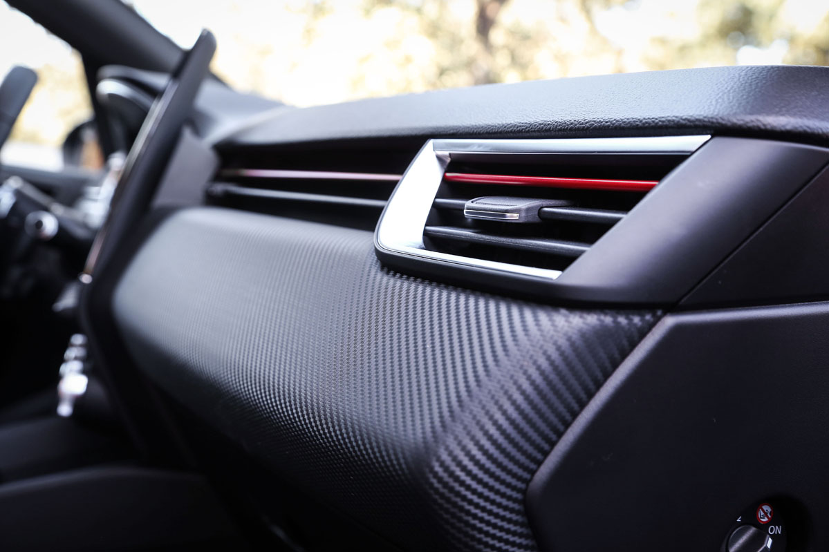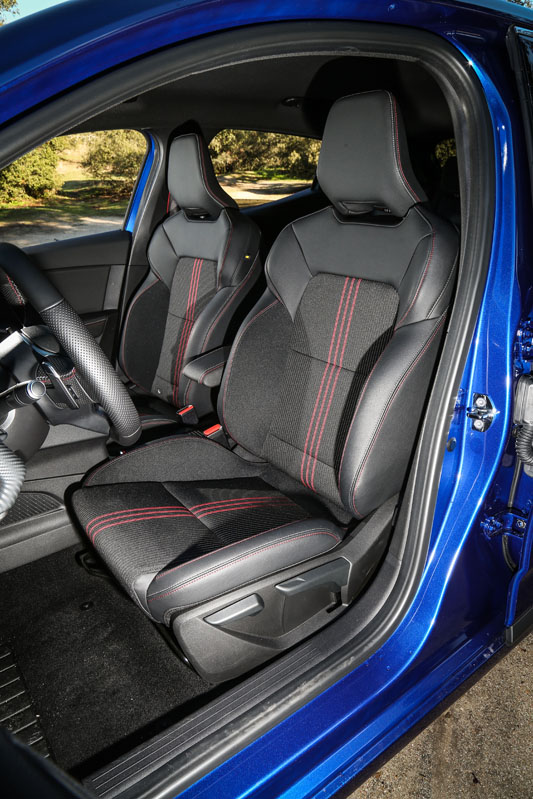 Acomodado en su asiento de corte deportivo, que combina tela y piel, agarro el volante, grueso, rematado con pespuntes en color gris y rojo y con los laterales en cuero perforado. La posición de conducción es buena, y las banquetas, bastante cómodas porque tienen un buen mullido, aunque sí echo en falta algo de regulación lumbar; no así de agarre lateral.