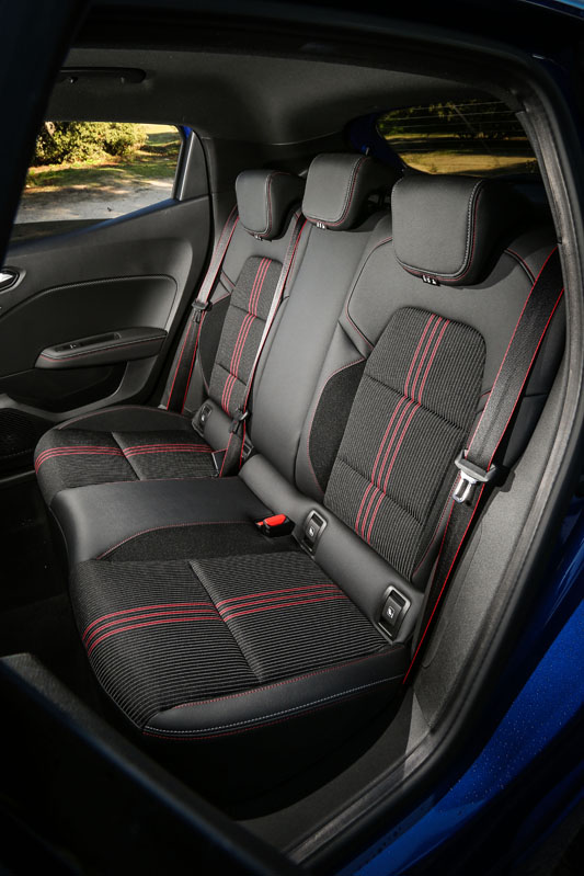 Y después de este repaso, continuo la prueba del Renault Clio V examinando el espacio que brinda está nueva generación a los pasajeros de las plazas traseras. El coche es más corto y estrecho que la generación precedente, pero la nueva plataforma, en la que se ha podido alojar el motor en un hueco menor, ha hecho que los pasajeros puedan disfrutar de un mejor espacio. En la segunda fila son tres dedos los que separan mi cabeza de tocar con el techo (mido 1,78 m) y cinco para que mis piernas hagan lo propio con el respaldo del asiento delantero.
