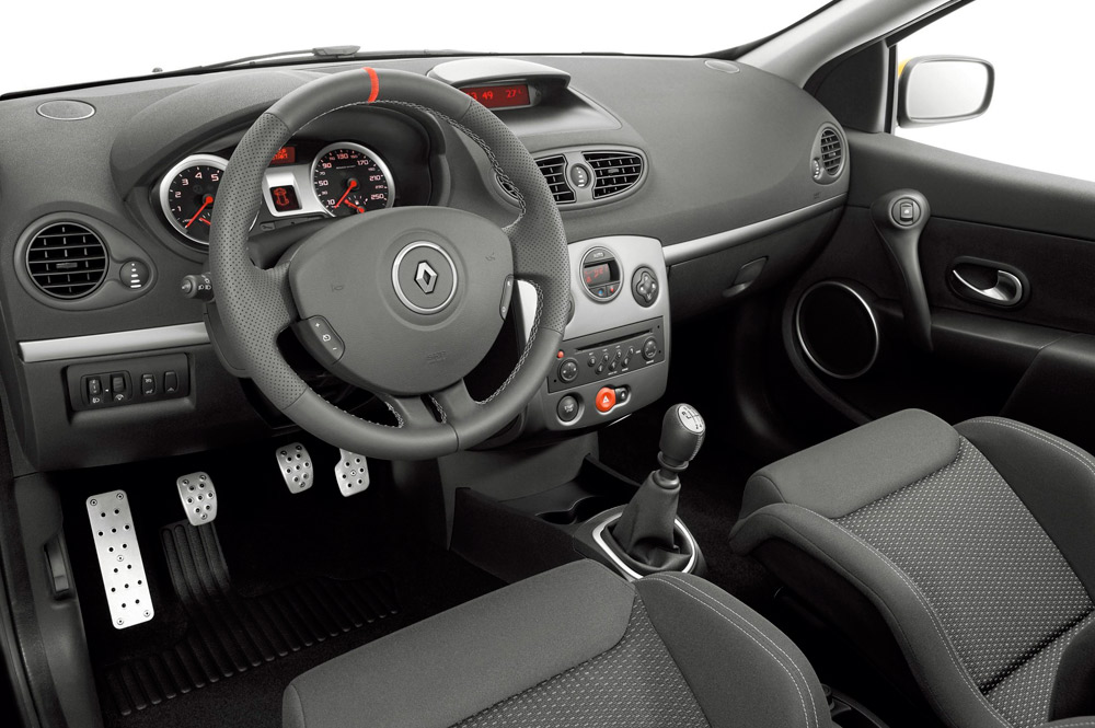 Si el aspecto exterior está muy logrado, el interior es austero en cuanto a detalles racing. A excepción de los envolventes y preciosos bacquets, los pedales deportivos en aluminio, el volante forrado en cuero y la placa con el número de unidad, los demás componentes son iguales que la versión más barata de la gama Clio.