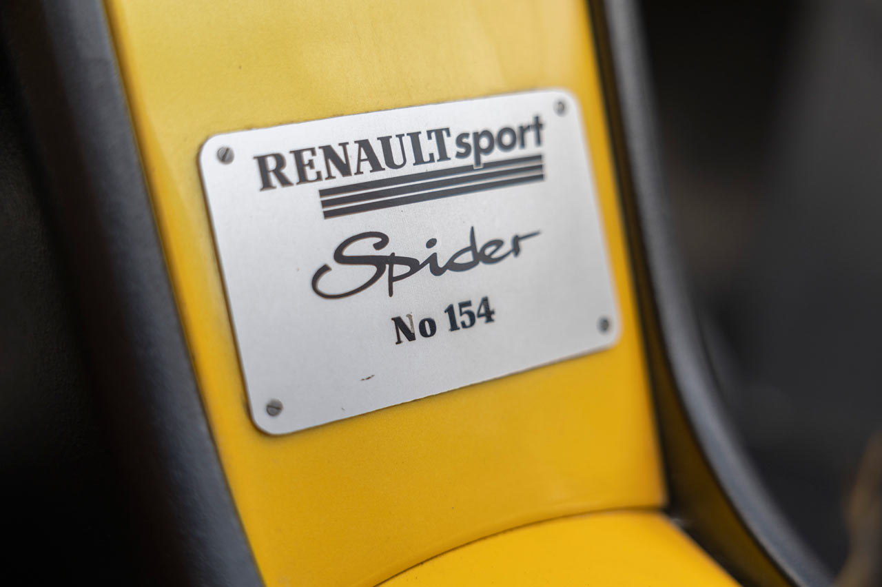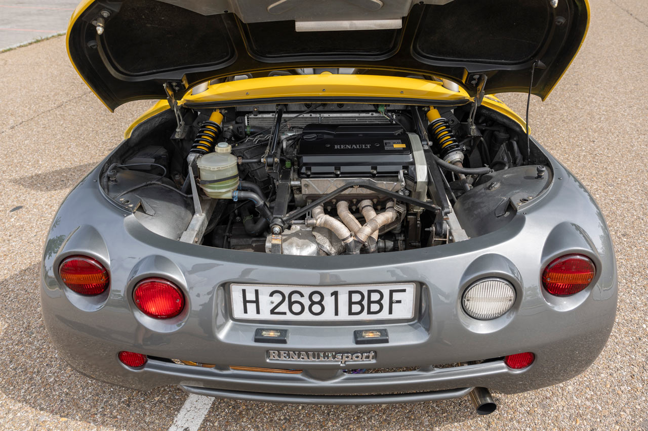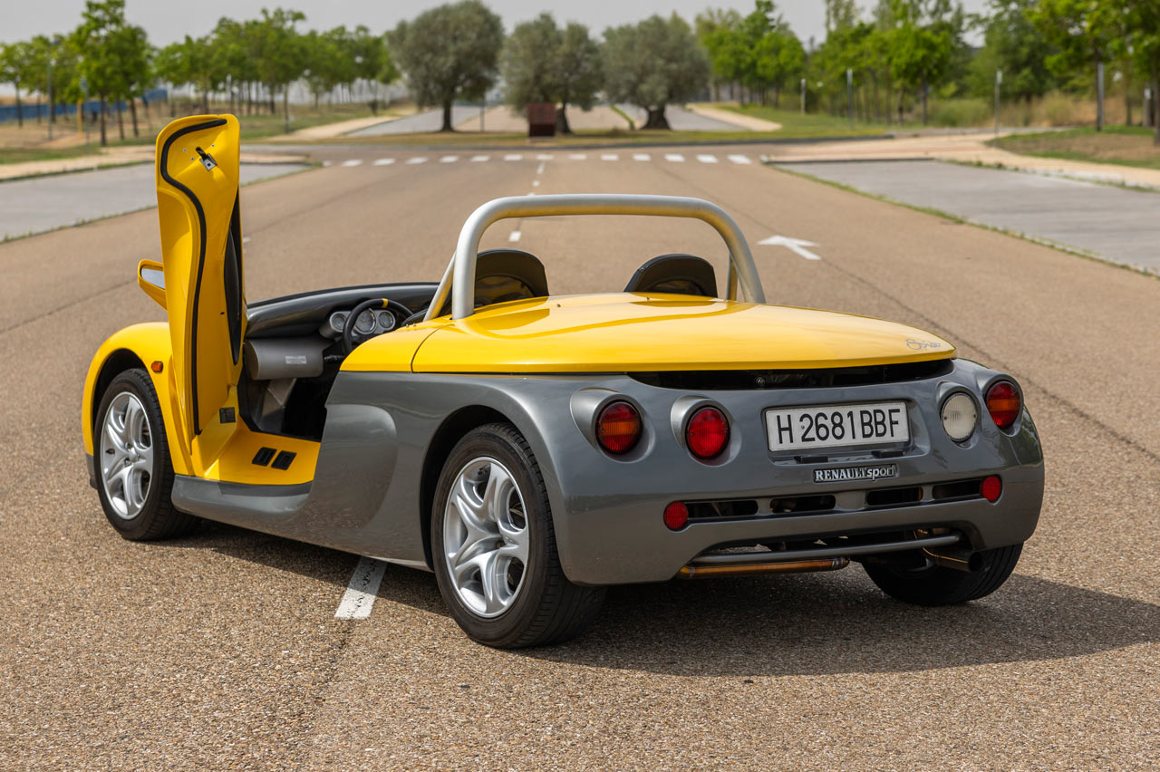 El Spider es extremadamente bajo, como corrobora su ficha técnica: 1,25 metros. También es cortito, 3,81 metros, y ancho, 1,83 metros. Y su pintura bicolor con esa combinación compuesta por el amarillo característico de Renault Sport -que por aquel entonces aún no lo era- y antracita le dan un toque único. Pero la verdadera nota de color la consigue su arco de protección y las enormes salidas de refrigeración del motor.