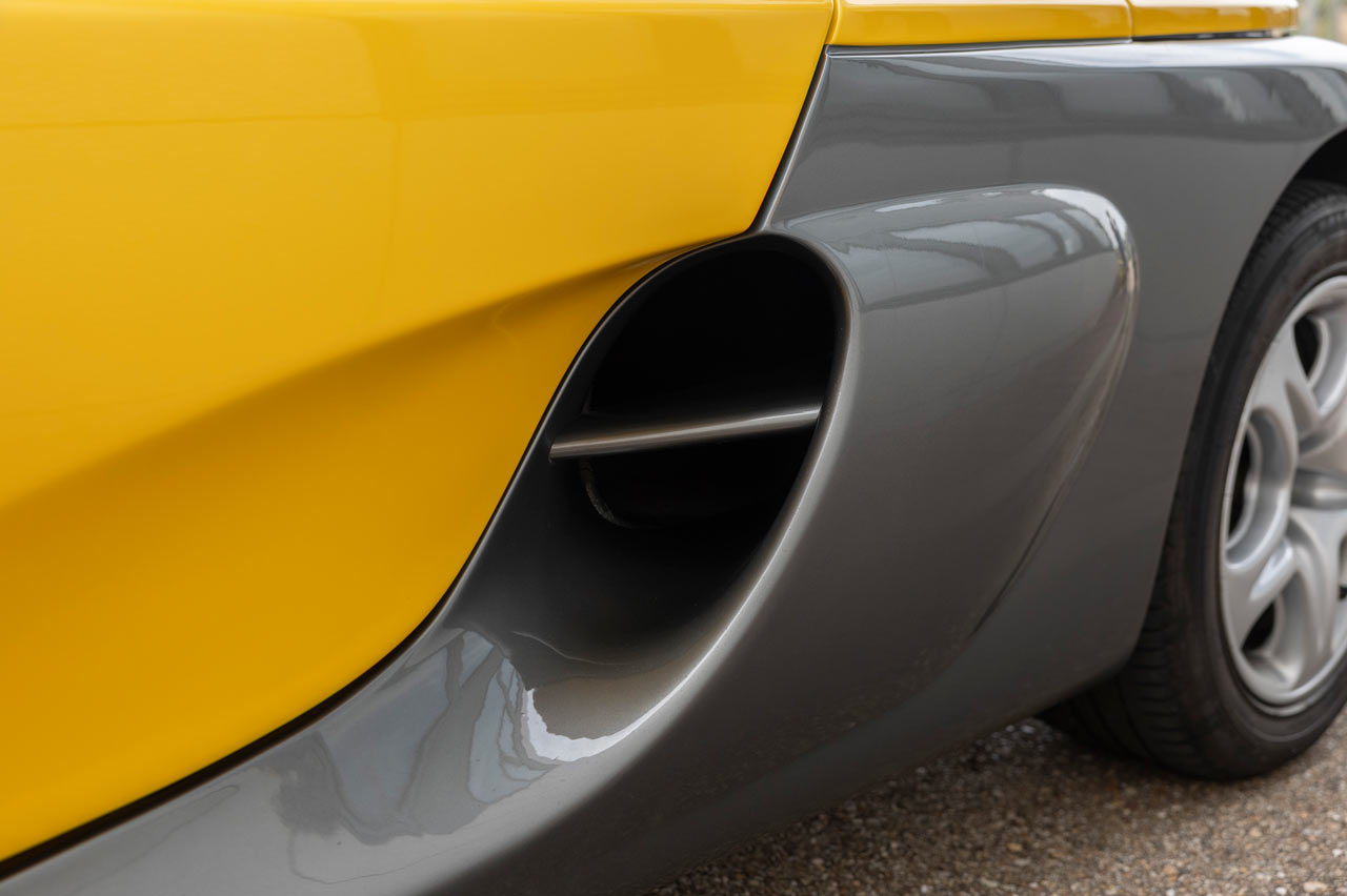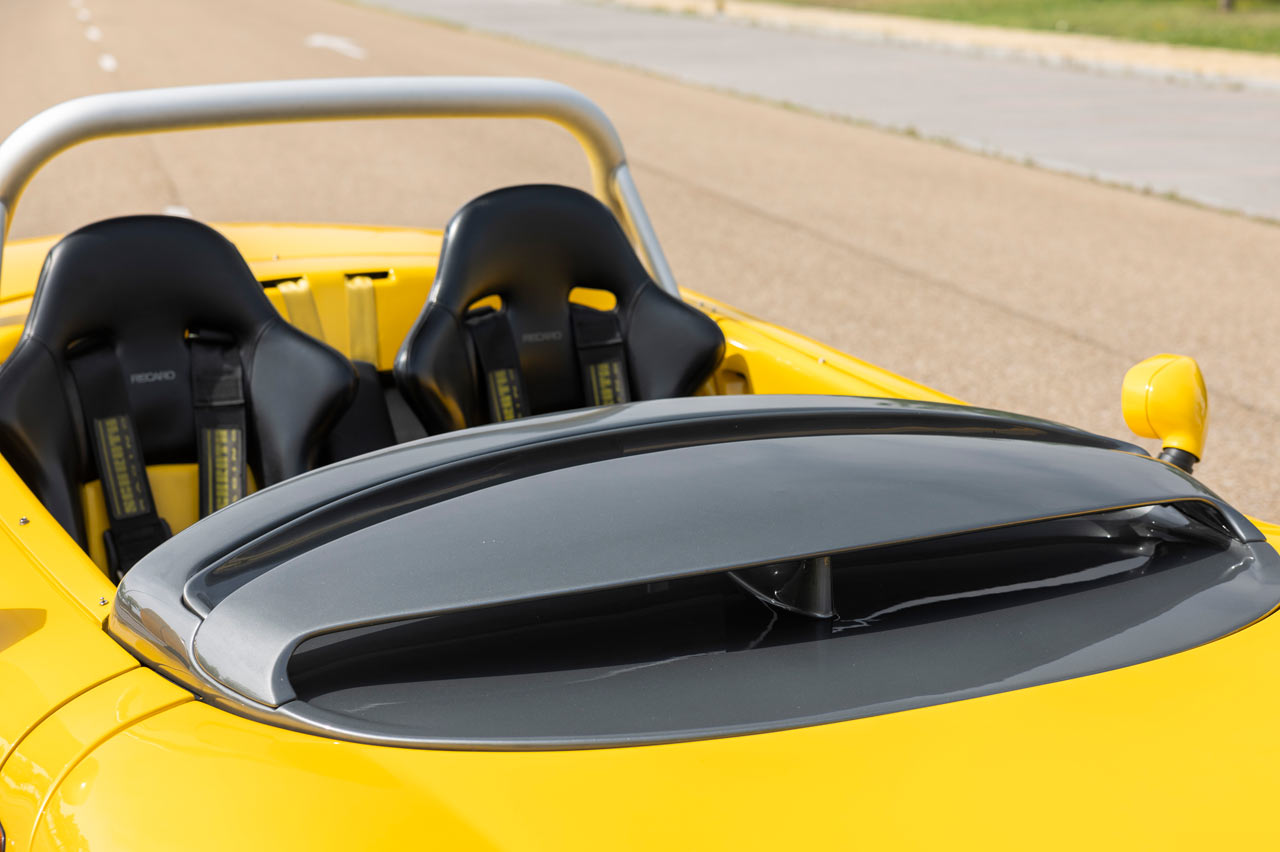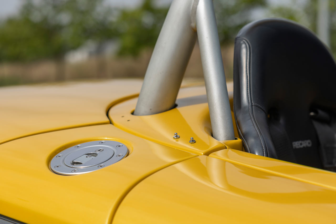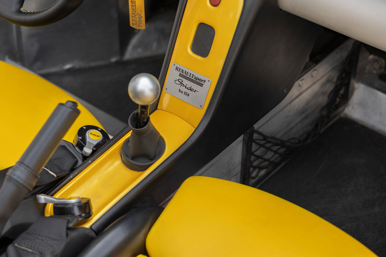 El Spider es extremadamente bajo, como corrobora su ficha técnica: 1,25 metros. También es cortito, 3,81 metros, y ancho, 1,83 metros. Y su pintura bicolor con esa combinación compuesta por el amarillo característico de Renault Sport -que por aquel entonces aún no lo era- y antracita le dan un toque único. Pero la verdadera nota de color la consigue su arco de protección y las enormes salidas de refrigeración del motor.