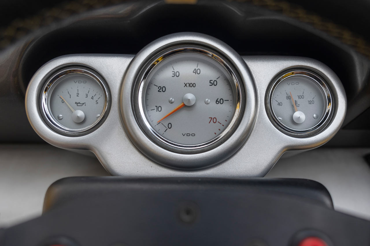 El puesto de mandos está compuesto por un cuadro de instrumentos situado detrás del volante -un volante que en el caso de esta unidad de pruebas del Renault Spider no es el de serie-, compuesto por tres relojes: el de la temperatura del refrigerante, la presión del aceite y el cuentarrevoluciones; este, de mayor tamaño, y ubicado en el centro.
