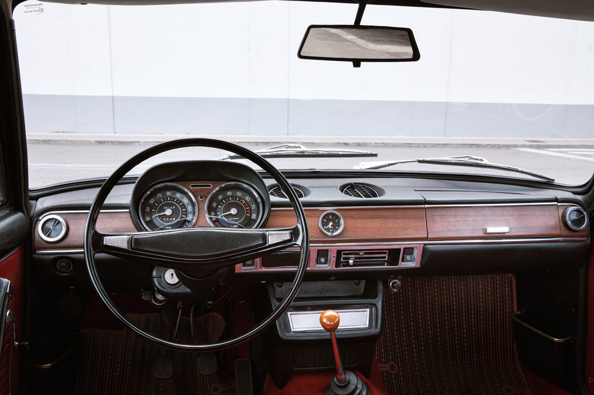 Una vez pasamos al interior, nos encontramos con los mullidos asientos tapizados en ante y escay rojo, que contrastan con el azul marino de la carrocería. Frente a nosotros se sitúa el sencillo volante de dos radios, a través del cual vemos perfectamente el cuadro de mandos con dos relojes. A la izquierda, el velocímetro, tarado hasta 170 km/h y que también incluye la lectura del aforador. A la derecha, el cuentavueltas, dentro del cual se integra el indicador de temperatura del motor. La relojería y la tira decorativa simíl madera que recorre el salpicadero de lado a lado, además del reloj horario central, dotan al interior del 1430 de un aspecto mucho más sofisticado que el 124. Los butacones delanteros son muy cómodos, pero en absoluto deportivos, algo típico en la época y que en todo caso encaja con la filosofía del catorce treinta, enfocado a ser una buena berlina con la que completar largos trayectos a buen ritmo.
