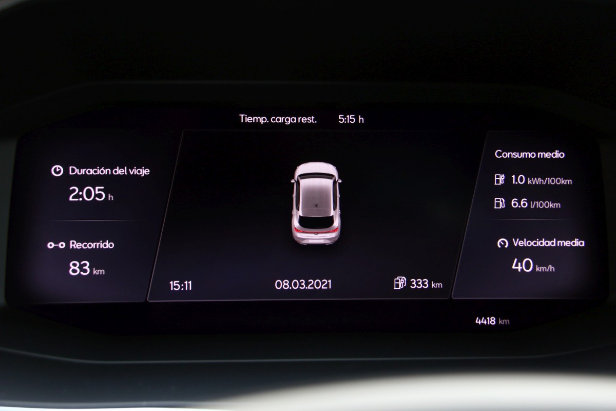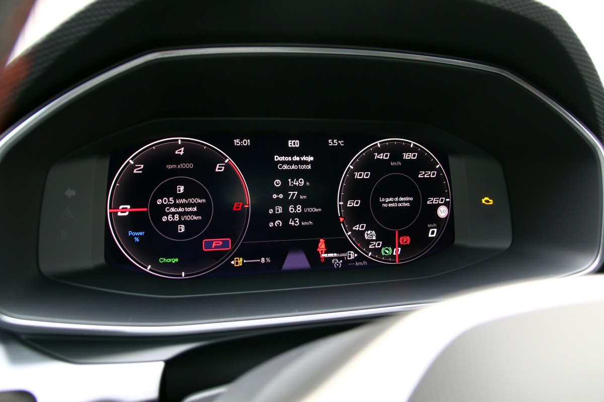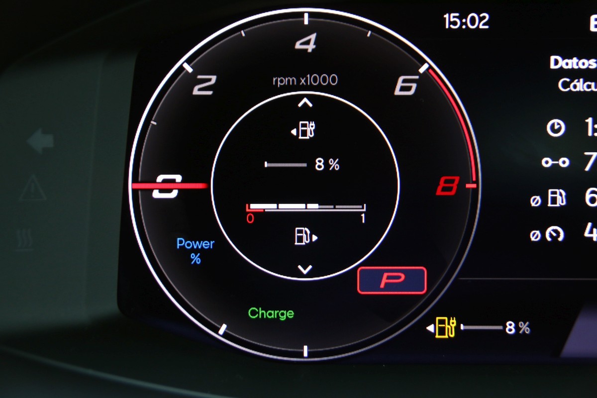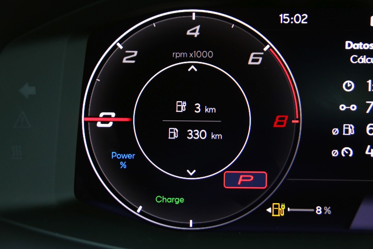 Antes de entrar en materia toda repasar qué cambia en el León e-Hybrid. Por fuera, los cambios son tan escuetos que se ciñen exclusivamente a la toma de carga situada sobre el paso de rueda delantero izquierdo. En el interior, además de tener un cuadro de instrumentos digital con esferas específicas, en la pantalla central táctil disponemos de menús exclusivos relativos al sistema híbrido.