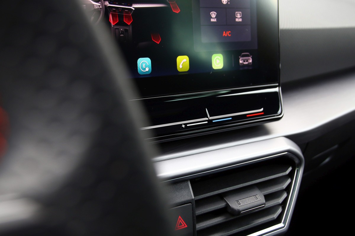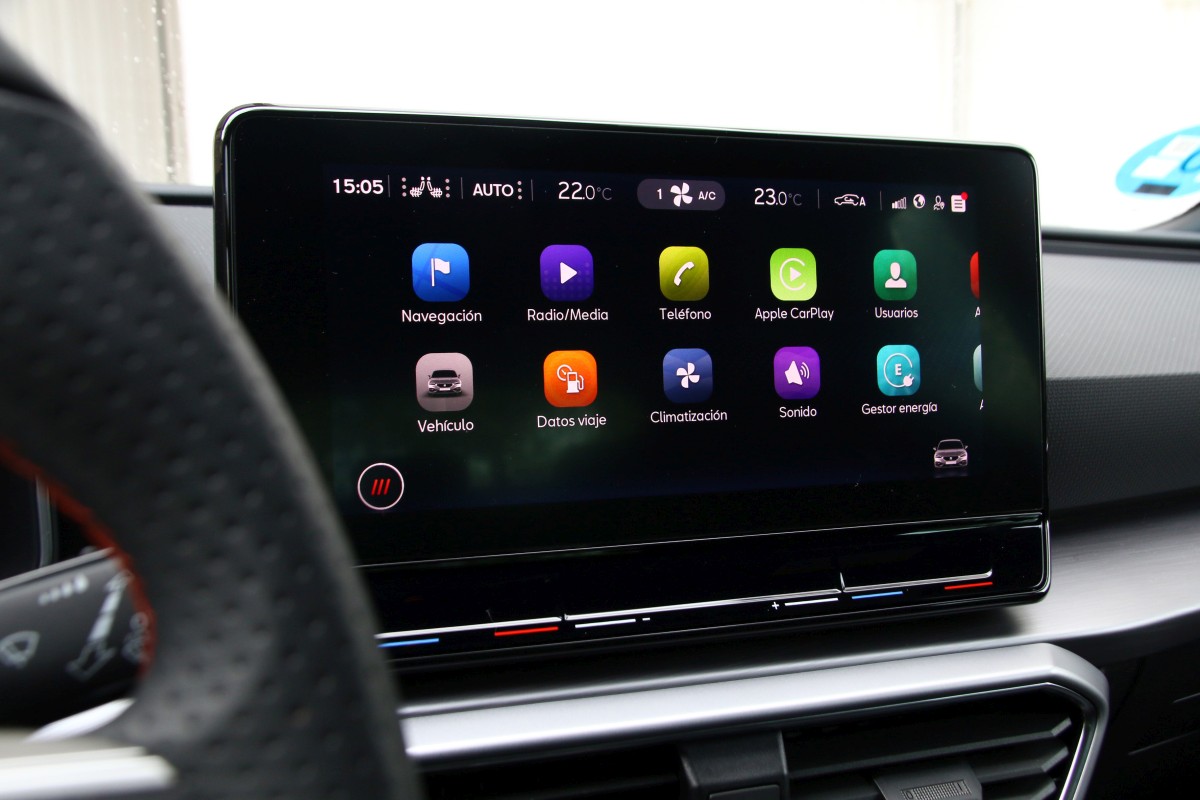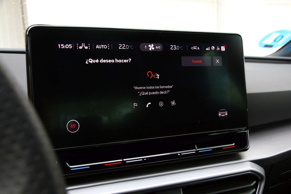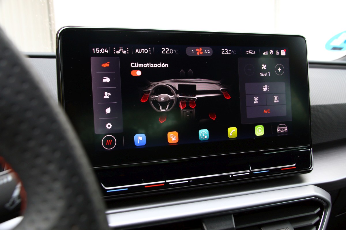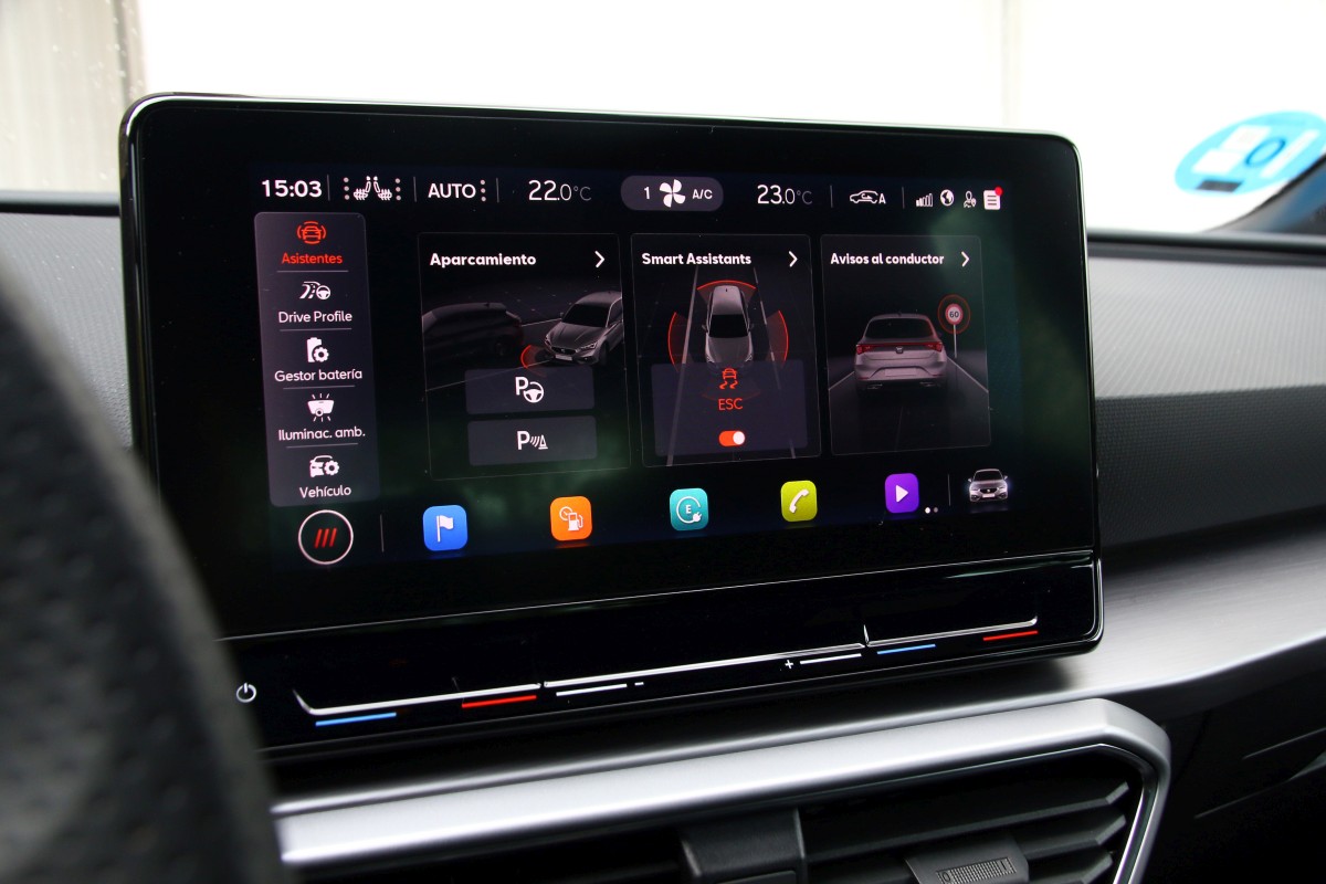 Antes de entrar en materia toda repasar qué cambia en el León e-Hybrid. Por fuera, los cambios son tan escuetos que se ciñen exclusivamente a la toma de carga situada sobre el paso de rueda delantero izquierdo. En el interior, además de tener un cuadro de instrumentos digital con esferas específicas, en la pantalla central táctil disponemos de menús exclusivos relativos al sistema híbrido.
