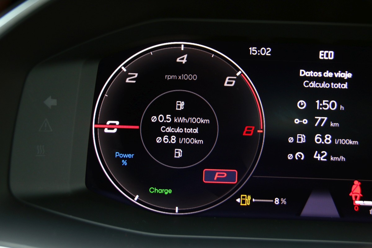 Como te decimos, es el peaje a pagar por tener el SEAT León más eficiente de la historia. porque una de las principales ventajas que obtendremos con este León e-Hybrid será, sin duda, su reducido consumo. En la semana de prueba la media de combustible registrada no ha superado los 3,3 l/100 km, llegando en muchos momentos a marcar 2,5 l/100 km. Un dato excelente, más para un vehículo de 204 CV de potencia conjunta.